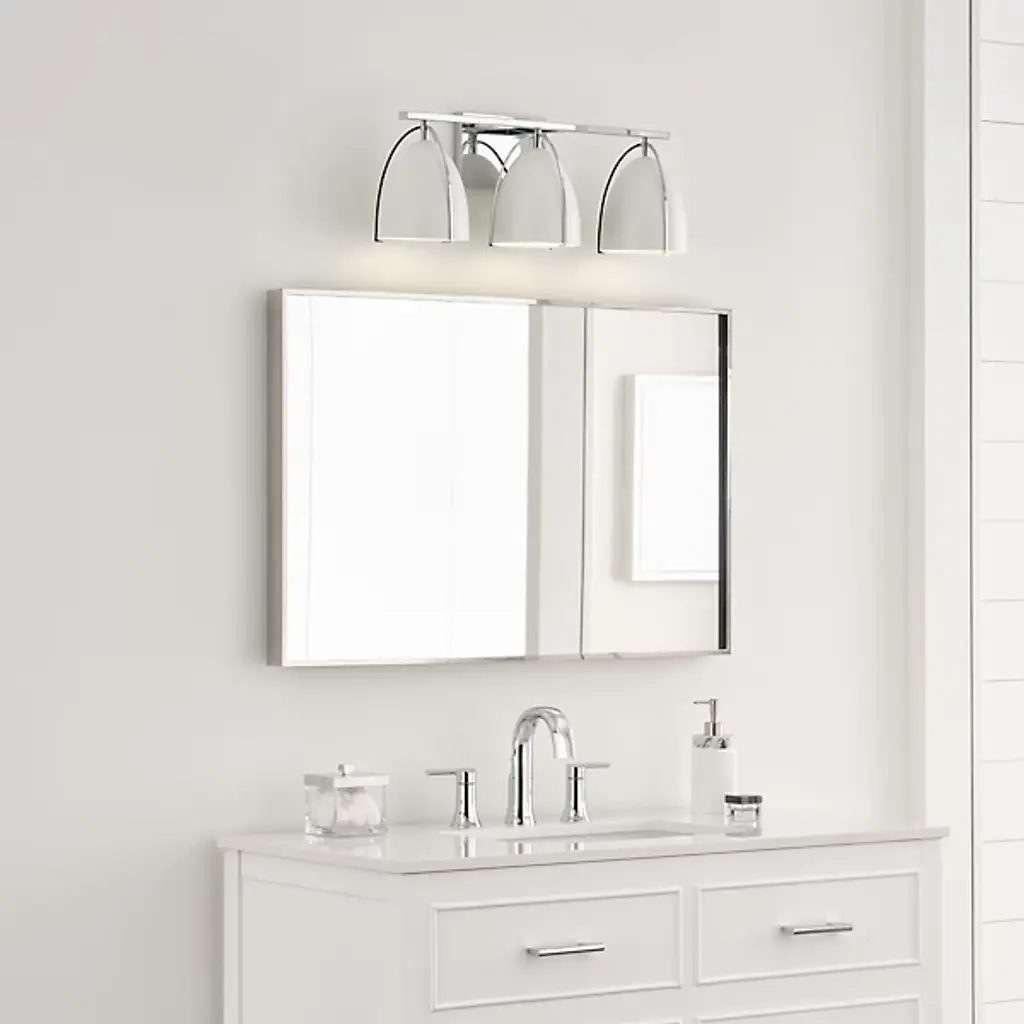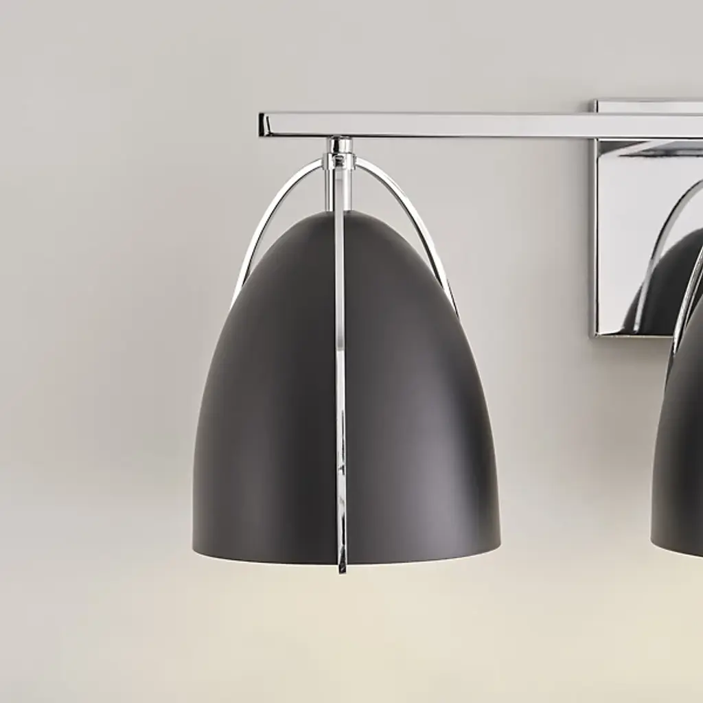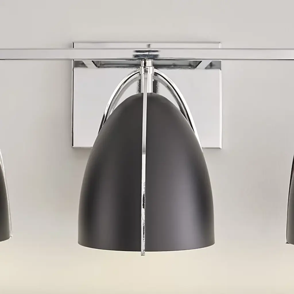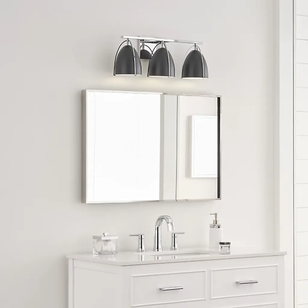 Quiet opulence. Give your modern mirror a high-style companion in the form of the Norman Bath Bar from Visual Comfort Studio, formerly known as Sea Gull Lighting, The bath bar’s helping of shapes makes this piece fit right over a rounded or rectilinear mirror. It makes a visual impression with a sleek backplate and crossbar. Curved contours stream down to create a delicate silhouette against the smooth surfaces of the steel shades. The bullet shades surround the bulbs to protect you from glare. The bulb’s light streams out the base of the shade as a clean fanned-out down glow.