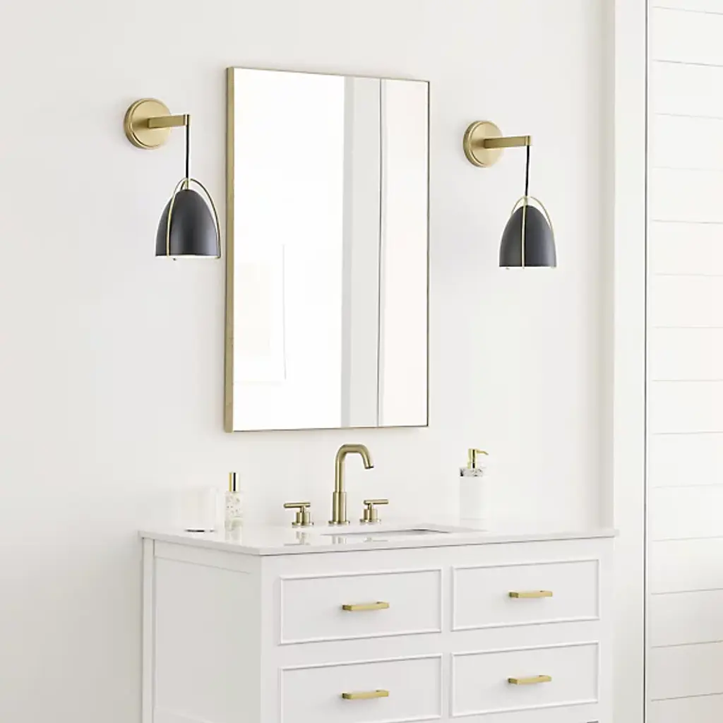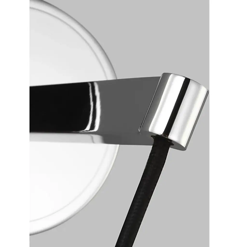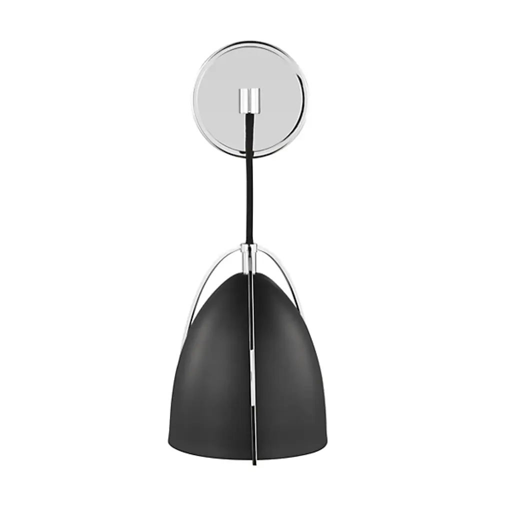 A bold and beautiful modern piece, the Norman Wall Sconce from Visual Comfort Studio, formerly known as Sea Gull Lighting, effortlessly shapes the décor of your home as it hangs on the wall. A smooth, disc-shaped back made of metal extends a thick arm that lowers a thin cord. The cord disappears inside the sleek, angled shade while matching metal travels down as thin arms, accenting the surface of the shade. The single bulb within fills it with warm light that effortlessly spills out below.