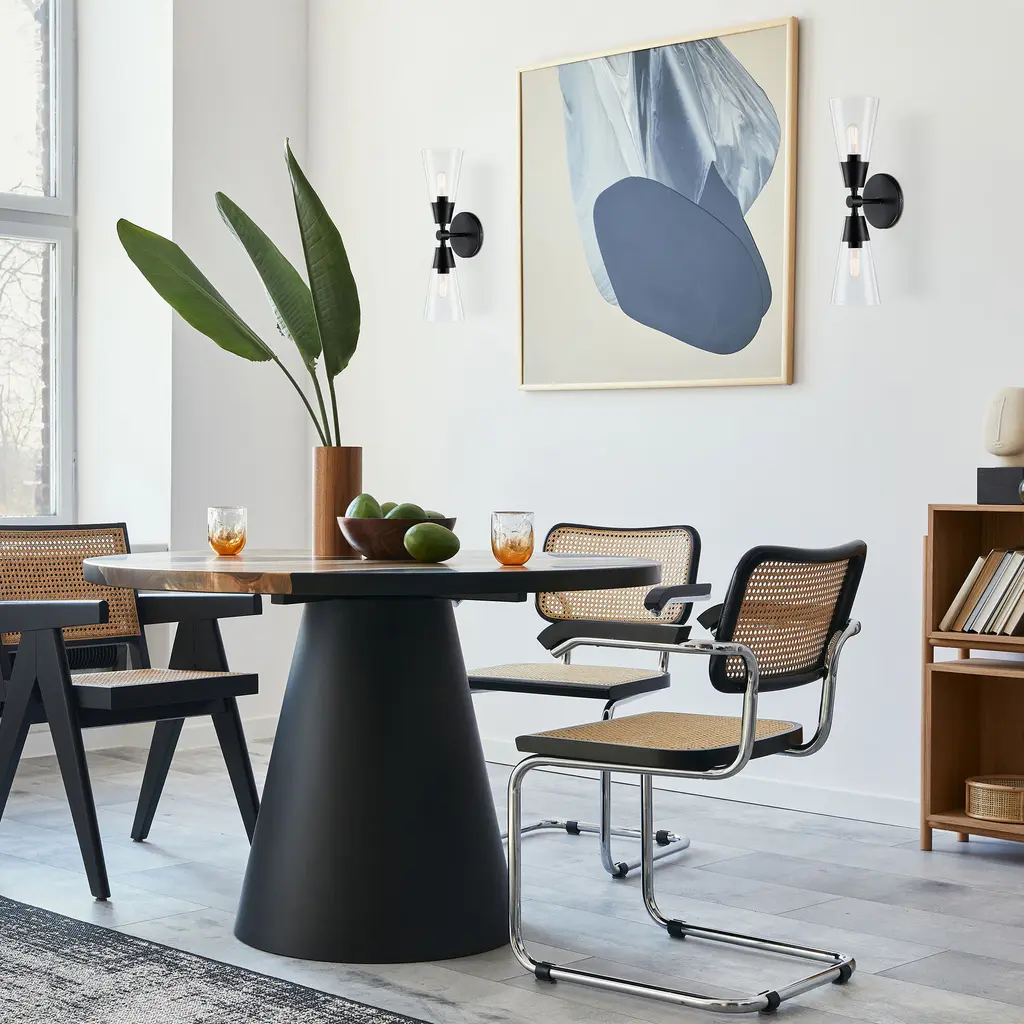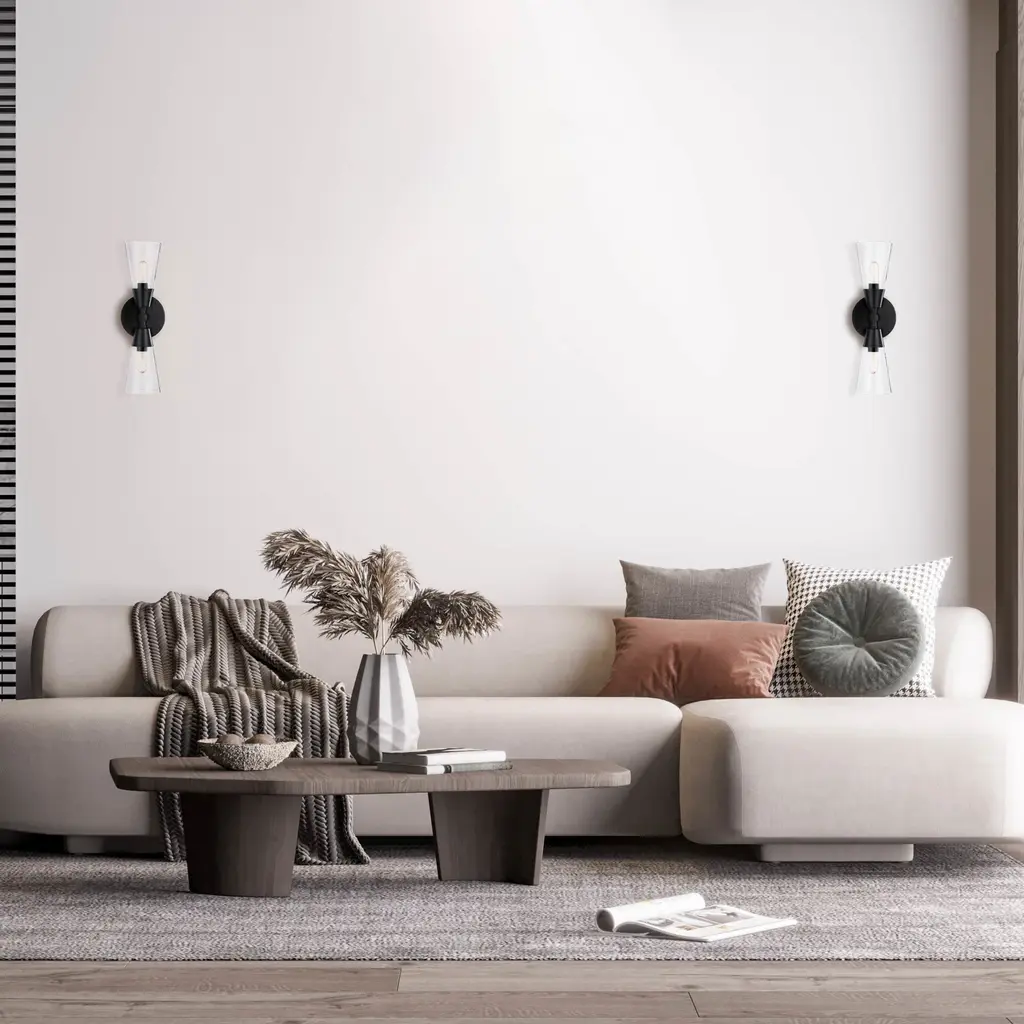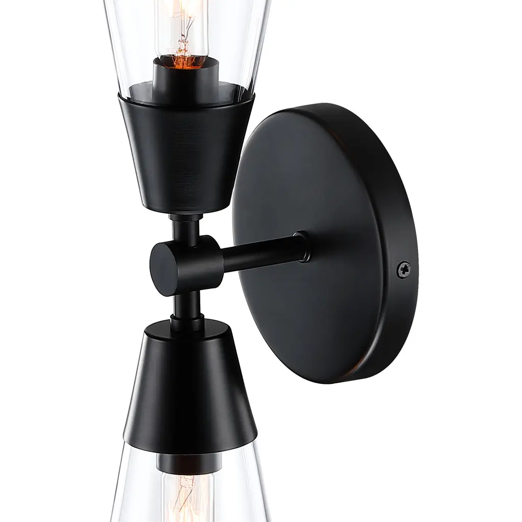 Designers Fountain's Norro family is modern geometric design at it best. Featuring conical clear glass shades and a sleek matte black finish, the minimalist look will be great many décors - especially mid-century modern homes or with retro-themed interior design. With a variety of configurations, you're sure to find the perfect piece to start conversations and make your visitors jealous.