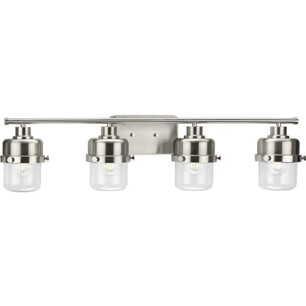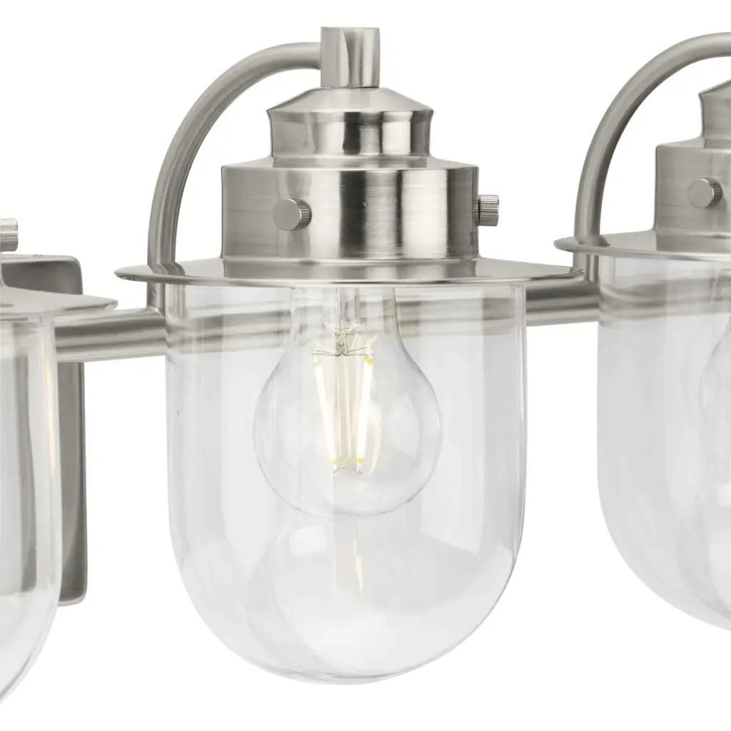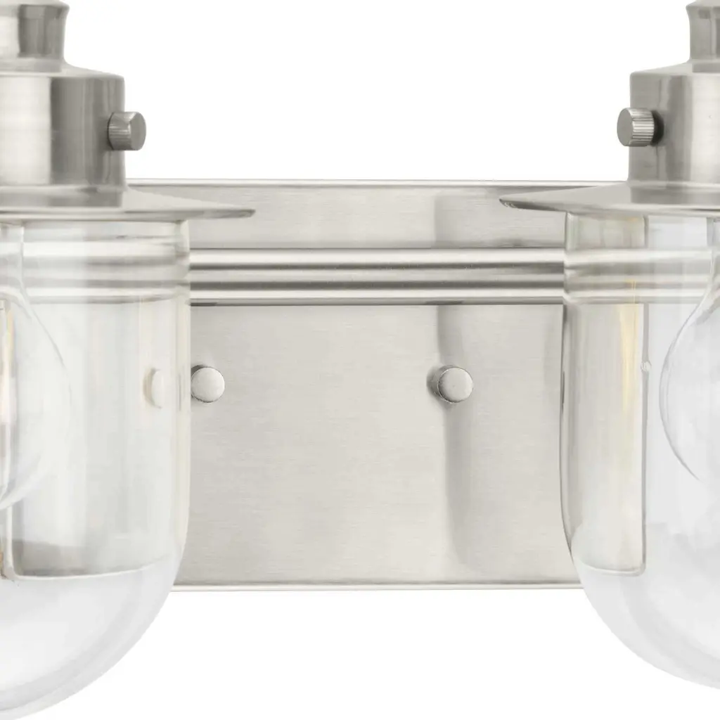The nostalgic Northlake Collection combines classic design influences with nautical inspiration. Finished in brushed nickel, the rounded diffuser and layered caps are reminiscent of floating buoys and weekends on a mountain lake. Clear glass shades cast a pleasing glow in bathrooms and powder rooms in coastal and transitional settings. This versatile fixture can be mounted up or down, increasing its design flexibility. It is cULus damp rated and has a one-year warranty to guarantee your complete satisfaction. Progress Lighting products offer exceptional quality, reliability, and functionality. .