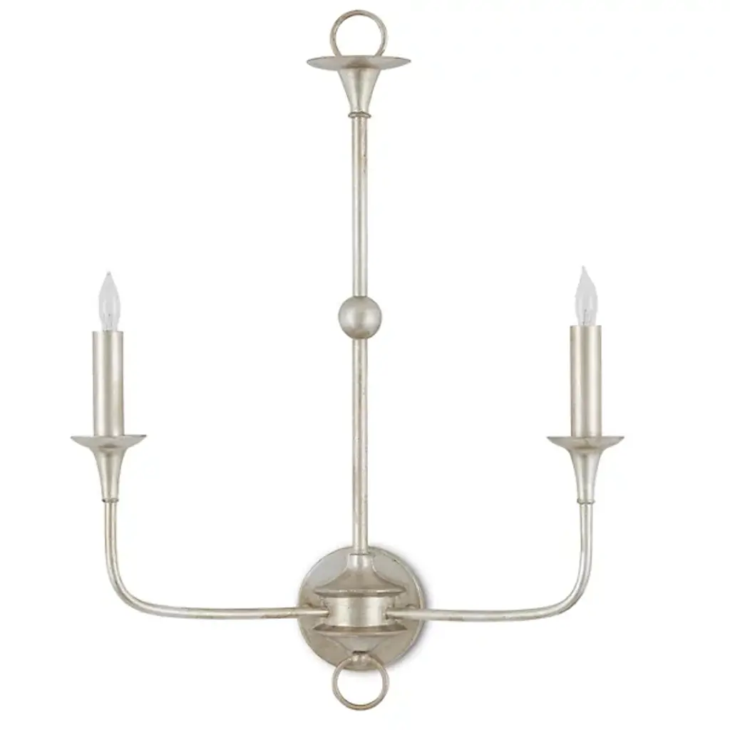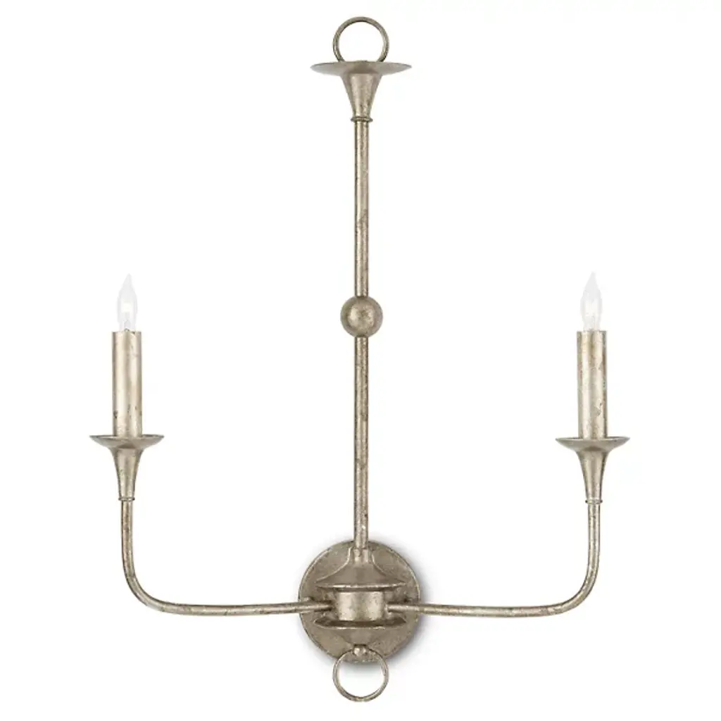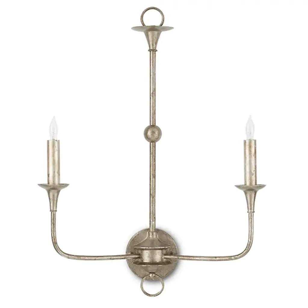 The Nottaway Double Wall Sconce by Currey & Company introduces a stylish and transitional lighting solution for your indoor walls. Its design showcases two gracefully extending arms emerging from a half-spool base, unveiling open candelabra-style lamping. Adorned with a delicate ring accent on the central stem, this sconce is designed with damp-listed lamping, ensuring its versatility in various settings. Its profile harmoniously incorporates into traditional and transitional interiors. The wrought iron frame’s metallic finish adds a touch of subtle textural interest, achieving a perfect fusion of vintage charm and graceful sophistication.