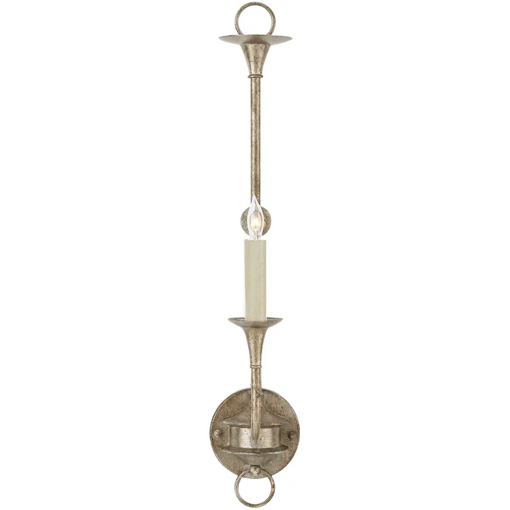 The arm of the Nottaway Bronze Wall Sconce stretches gracefully from a half-spool shape that rests at the bottom of its stem, ornamented with a dainty ring. Though this is a seriously minimalist fixture, the profile of the aged silver wall sconce has a lovely fluidity to it that also makes it a natural choice for traditional and transitional interiors. The pyrite bronze finish on the wrought iron frame adds a heavy dose of textural interest.