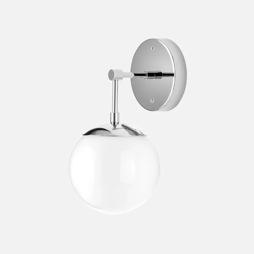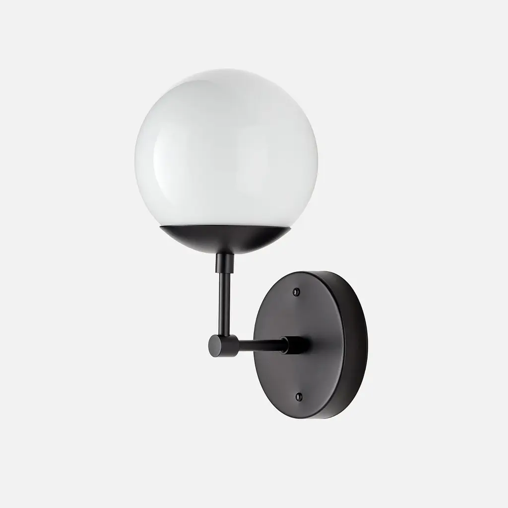 The Nova L Sconce flashes starry brilliance in any space it’s seen in. Its orb-like shade and slender L-rod silhouette nods to the geometric tendencies of mid-century modern design, but the Nova also blends into a variety of more traditional rooms due to its craftsmanship and quality of light. Choose between opal and clear glass shades and among four elegant paint or patina options. Assembled in our Portland, Ore. factory using ethically-sourced domestic and global components. A Schoolhouse Original. Learn how to choose perfect wall sconce placement on our blog.