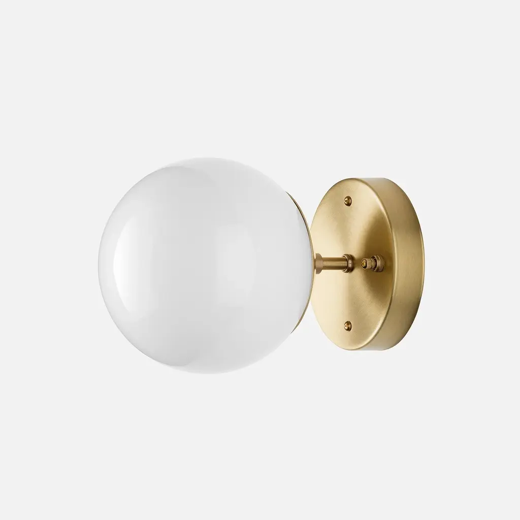 The Nova Sconce flashes starry brilliance in any space it’s seen in. Its orb-like shade nods to the geometric tendencies of mid-century modern design, but the Nova also blends into a variety of more traditional rooms due to its craftsmanship and quality of light. Comes with an opal glass shade and your choice of four elegant paint or patina options. Assembled in our Portland, Ore. factory using ethically-sourced domestic and global components. A Schoolhouse Original. Learn how to choose perfect wall sconce placement on our blog.