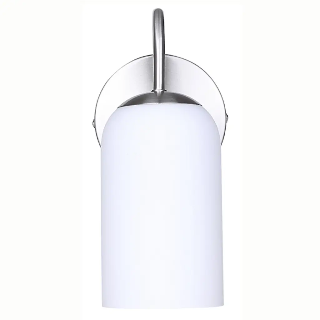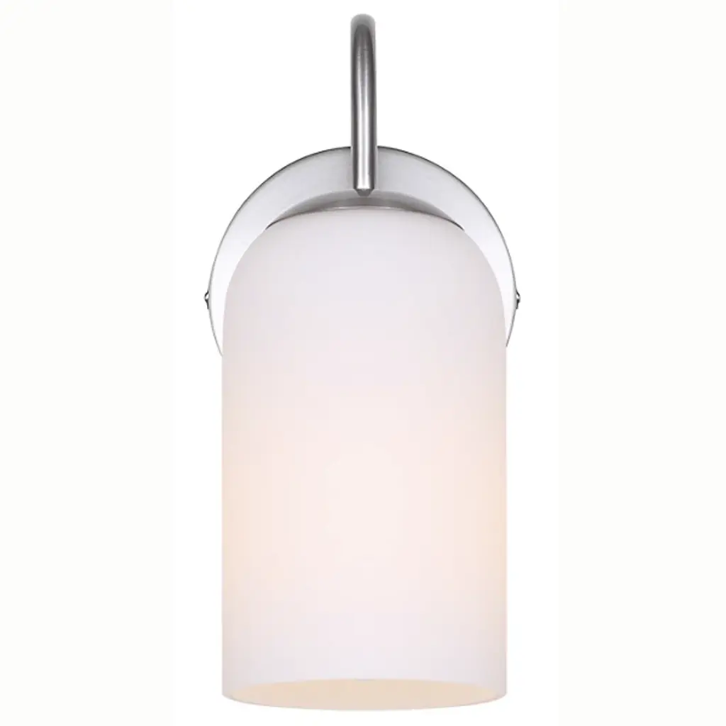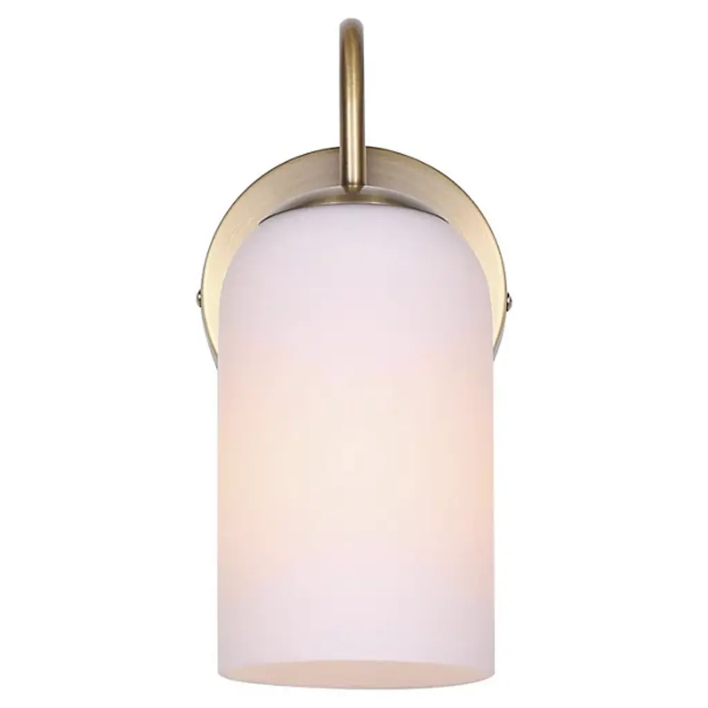The Novalee Wall Sconce from Canarm extends from its circular backplate with a curved arm that presents a cylindrical opal glass shade. The arched support creates visual tension through its deliberate positioning, appearing to reach out from the wall. Light diffuses evenly through the glass cylinder, eliminating harsh shadows while providing ample illumination for bathroom tasks. The fixture's modest footprint makes it well-suited for narrower walls or smaller bathrooms where space efficiency matters. It brings intentional design to often overlooked bathroom lighting needs, proving that useful fixtures can also enhance a room's overall aesthetic.