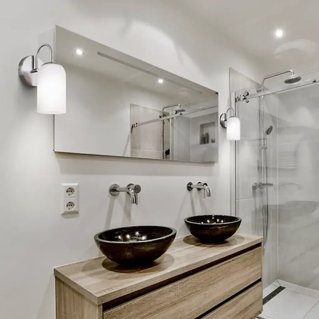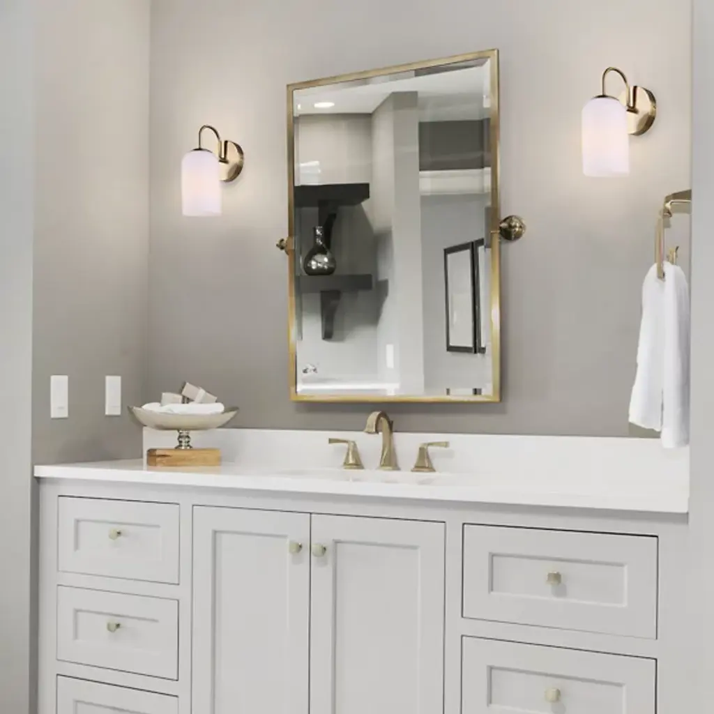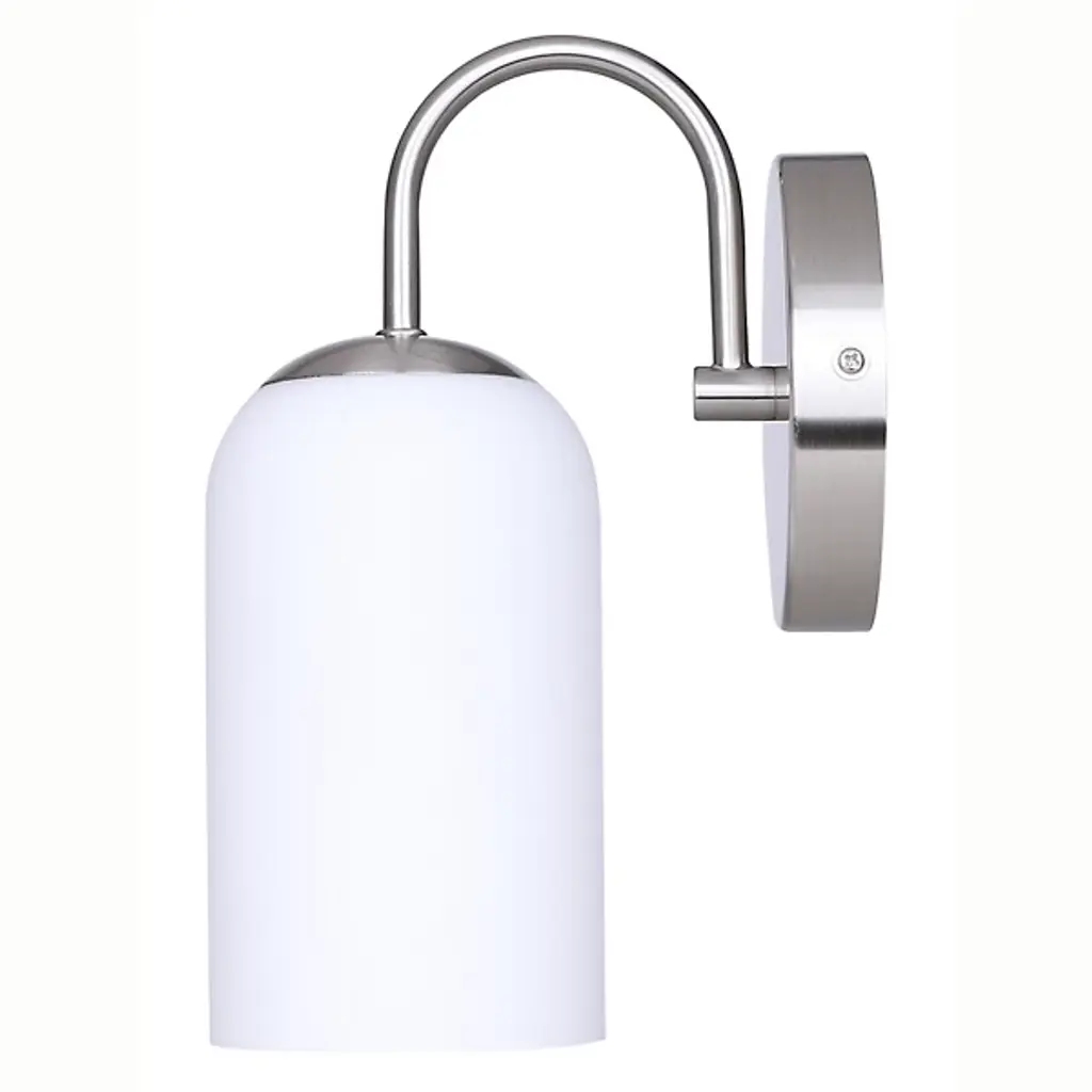 The Novalee Wall Sconce from Canarm extends from its circular backplate with a curved arm that presents a cylindrical opal glass shade. The arched support creates visual tension through its deliberate positioning, appearing to reach out from the wall. Light diffuses evenly through the glass cylinder, eliminating harsh shadows while providing ample illumination for bathroom tasks. The fixture's modest footprint makes it well-suited for narrower walls or smaller bathrooms where space efficiency matters. It brings intentional design to often overlooked bathroom lighting needs, proving that useful fixtures can also enhance a room's overall aesthetic.