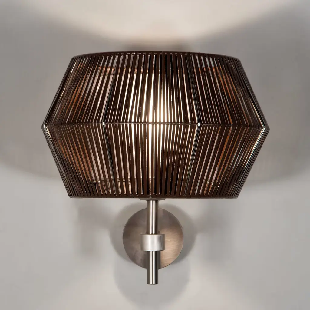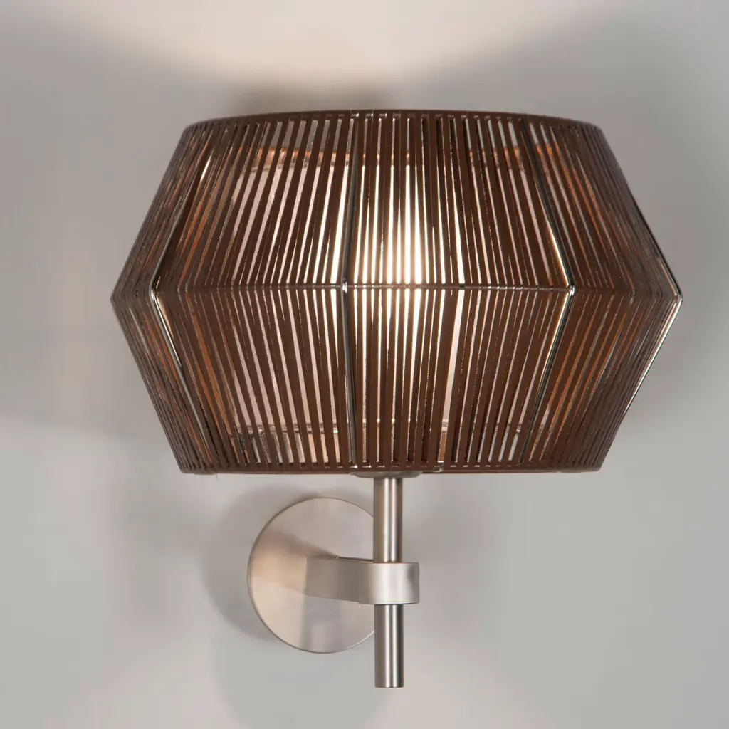 The peculiarity that makes this collection unique is the lampshade and its particular shape: available in brown eco-leather and white string. A system of repeating proportions and modules, wisely assembled by the expert hands of the artisans. The collection consists of a large number of models developed horizontally and vertically. 1-lights wall lamp. Bulb not supplied. Available in custom sizes and finishes. Metal and textile. Satin nickel and brown eco leather.