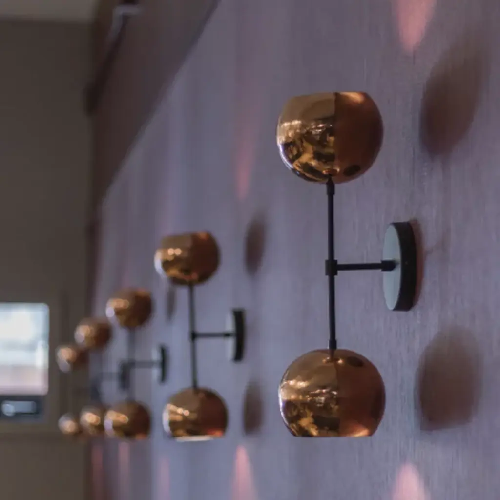 Infuse barren walls with a touch of North African flair with the Nur Dual Globe Wall Sconce, designed by Moroccan-based studio Dounia Home. Exemplifying the modern quality of the piece is a clean, circular backmount and linear arms which together emphasize pleasing symmetry. Made with centuries-old techniques commonly used in Moroccan architecture, 2 globe Metal shades are meticulously detailed by hand with a sophisticated, abstract pattern of perforated dots and arching shapes. Inside light softly highlights the subtle detailing while funneled out the shade’s openings.