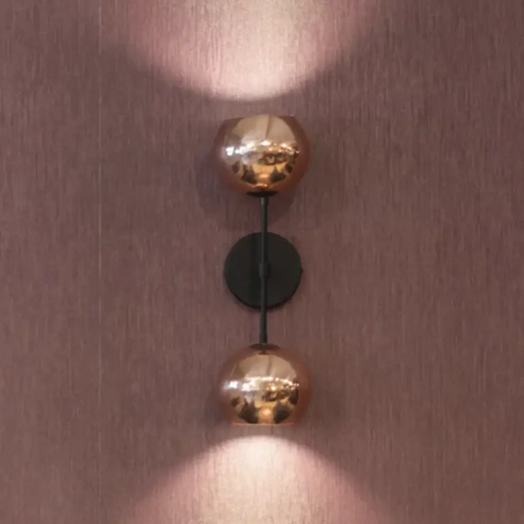Infuse barren walls with a touch of North African flair with the Nur Dual Globe Wall Sconce, designed by Moroccan-based studio Dounia Home. Exemplifying the modern quality of the piece is a clean, circular backmount and linear arms which together emphasize pleasing symmetry. Made with centuries-old techniques commonly used in Moroccan architecture, 2 globe Metal shades are meticulously detailed by hand with a sophisticated, abstract pattern of perforated dots and arching shapes. Inside light softly highlights the subtle detailing while funneled out the shade’s openings.