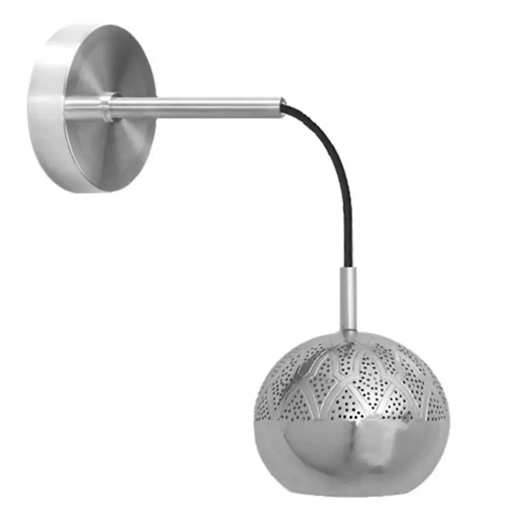 Illuminate your bedroom with the warmth and sophistication of a Moroccan caravanserai. The Nur LED Wall Sconce from Dounia Home mixes traditional design notes with smooth, contemporary materials and black power cables, each hand-assembled from locally-sourced materials by Moroccan artisans. The low-profile wall mount holds a round metal stem, interrupted by a black cable that curves gently down towards a globe-shaped shade. With a round opening at the bottom and a pierced top half of swirling geometric patterns picked out in pinholes, this sconce provides ample warm ambiance to light your way.