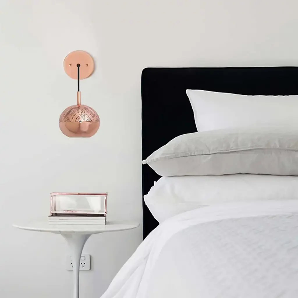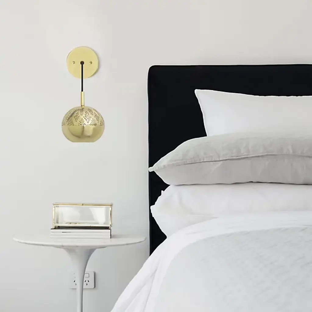 Illuminate your bedroom with the warmth and sophistication of a Moroccan caravanserai. The Nur LED Wall Sconce from Dounia Home mixes traditional design notes with smooth, contemporary materials and black power cables, each hand-assembled from locally-sourced materials by Moroccan artisans. The low-profile wall mount holds a round metal stem, interrupted by a black cable that curves gently down towards a globe-shaped shade. With a round opening at the bottom and a pierced top half of swirling geometric patterns picked out in pinholes, this sconce provides ample warm ambiance to light your way.