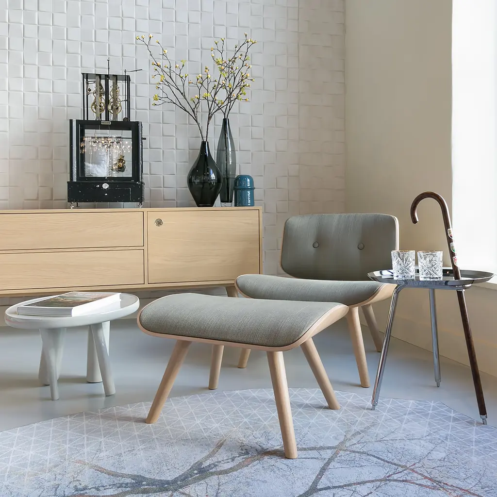 Designer Marcel Wanders adds a footrest for savoring the complete lounging experience when ensconced in his Nut lounge chair. As with the companion seating, it’s fashioned in solid oak in an assortment of modern woodgrain hues. And the same range of refined upholstery selections assures a polished look to match the chair.