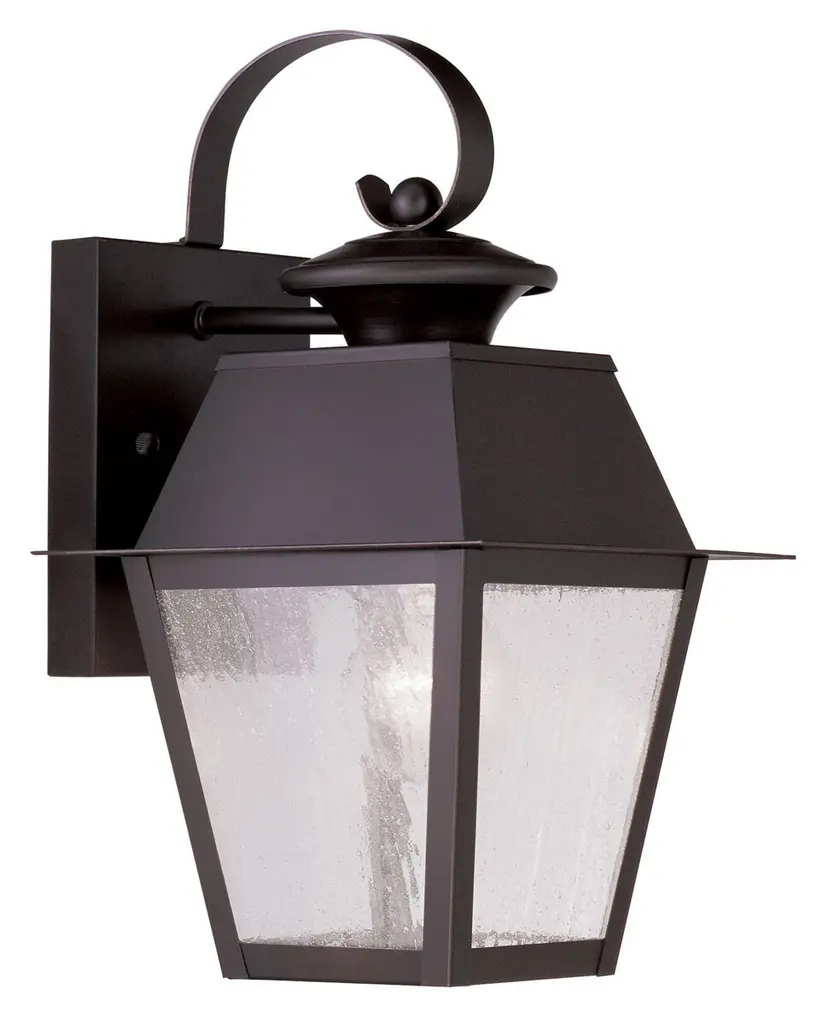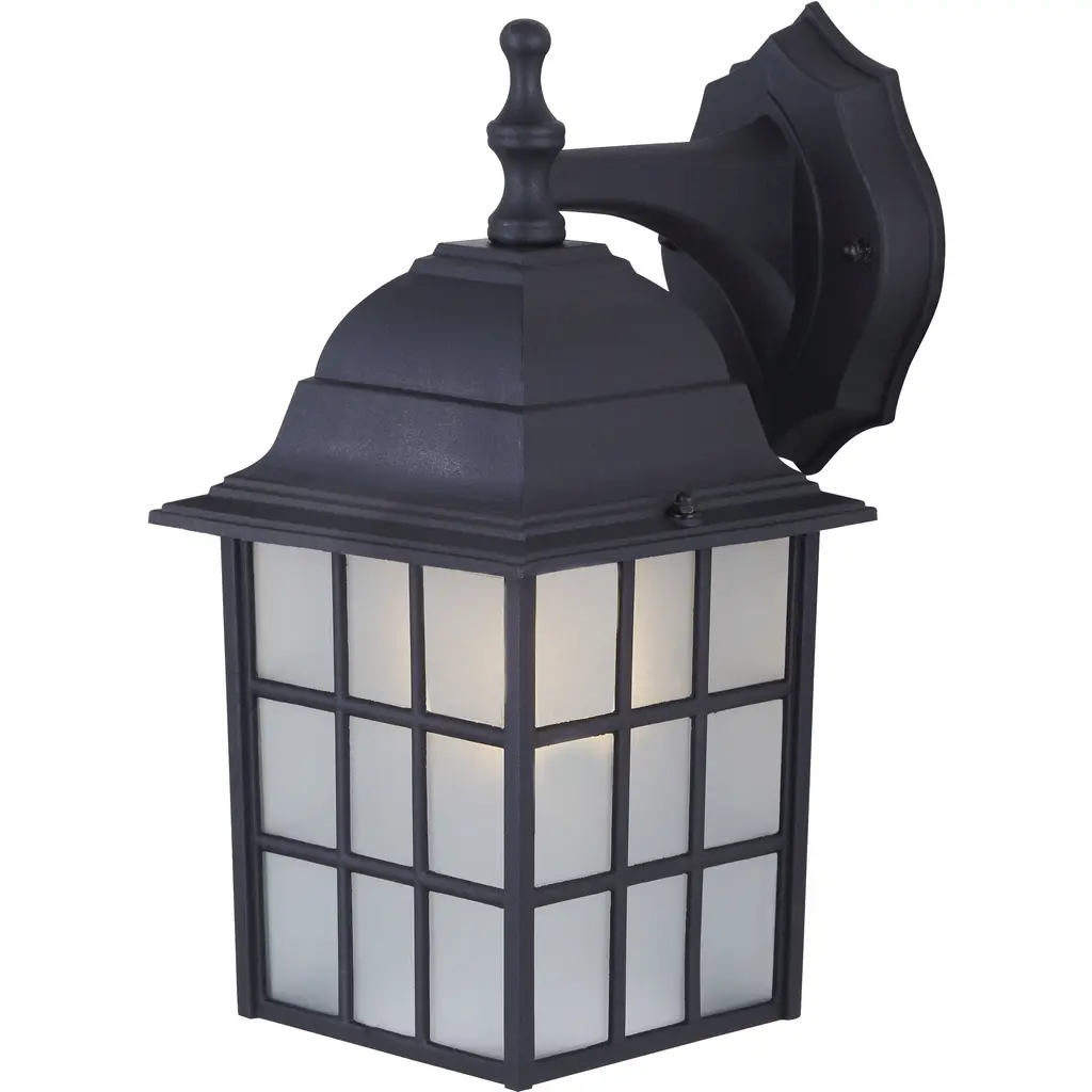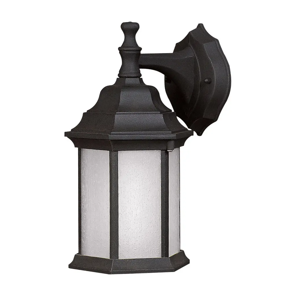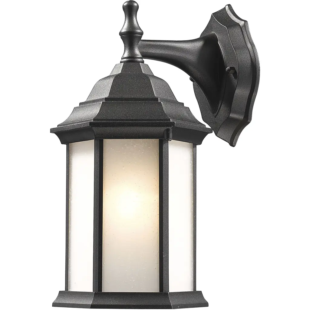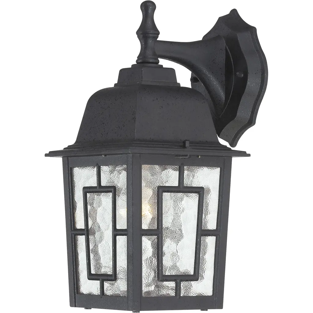 Collection: Banyon, Material: Metal, Width: 6.125", Height: 12.25", Depth: 8", Height From Outlet Box: 9.25", Number Of Bulbs: 1, Wattage: 100 Watts, Moisture Rating: Wet Rated, Desc: The Banyan collection has a pleasing architectural aesthetic and features geometric inlays atop its clear water glass. This collection is offered in three finishes; white, rustic bronze, and textured black. The Banyan collection with its strong design and handsome finishes will be a welcome addition to any home. Rated: Wet.,