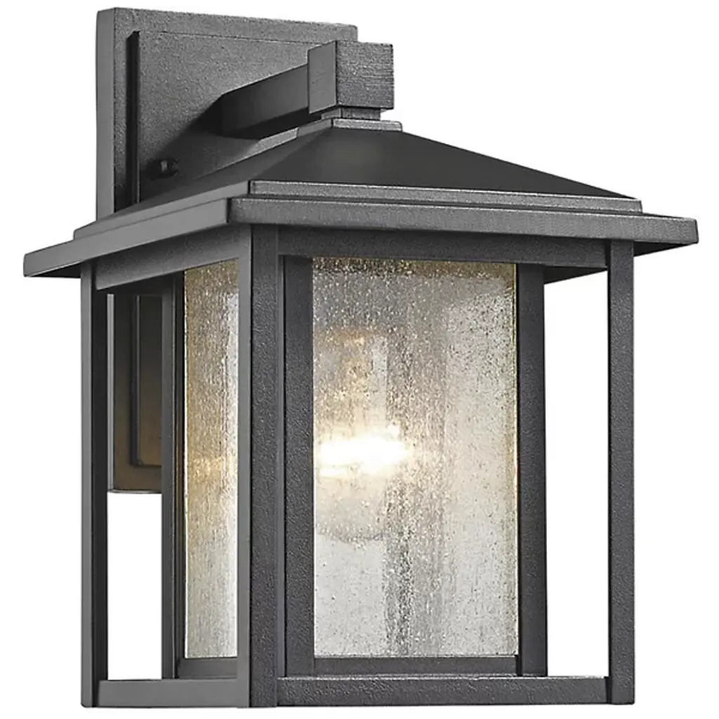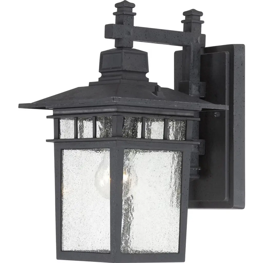 Collection: Cove Neck, Material: Metal, Width: 7", Height: 11.75", Depth: 9.5", Height From Outlet Box: 5.25", Number Of Bulbs: 1, Wattage: 100 Watts, Moisture Rating: Wet Rated, Desc: The Cove Neck collection draws some of its inspiration from the far east and mixes it with a touch of Americana, creating a unique design all to its own. This collection is beautifully finished in white, rustic bronze or textured black and complimented with clear seed glass. The Cove Neck collection will add sophistication as well as style to your homes curb appeal. Rated: Wet.,