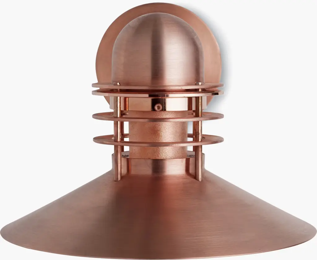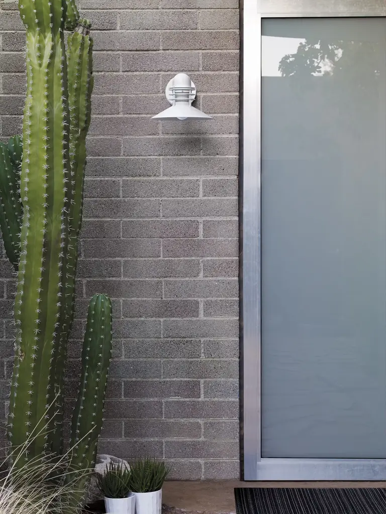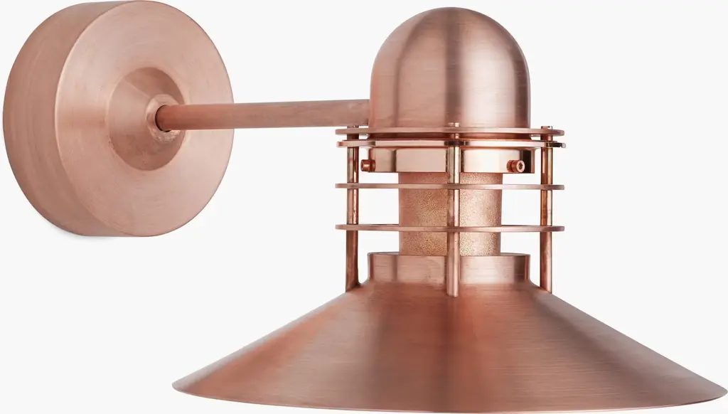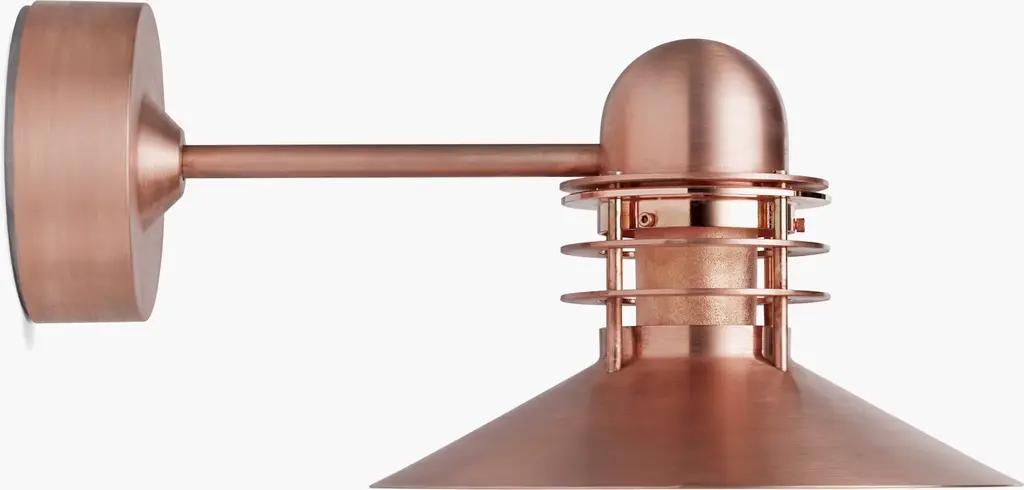 Prizewinner in an exterior lighting competition hosted by Louis Poulsen, the Nyhavn Outdoor Wall Sconce (1976) was designed by Alfred Homann and Ole V. Kjær. Homann explains the duo's concept for the sconce was primarily focused on making it compact and subtle. “It was important that the fixture was smaller and more discreet than the other products on the market at that time," he says. Nyhavn is characterized by a broad cone-shaped shade with matte white painted underside for projecting soft, even light. Three rings on top minimize glare and also direct a small amount of light both outward and upward. Copper variant will develop a patina over time. Bulb (not included): incandescent 100W/A19/E26 or comparable CFL or LED. UL listed for use outdoors. Made in Denmark.