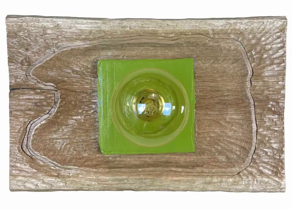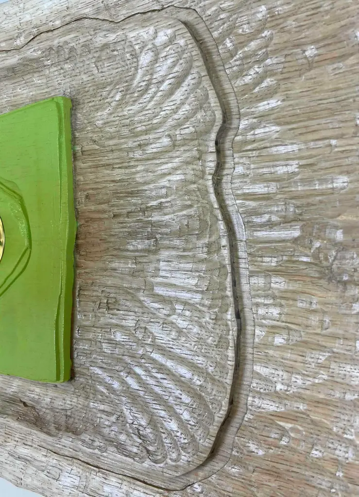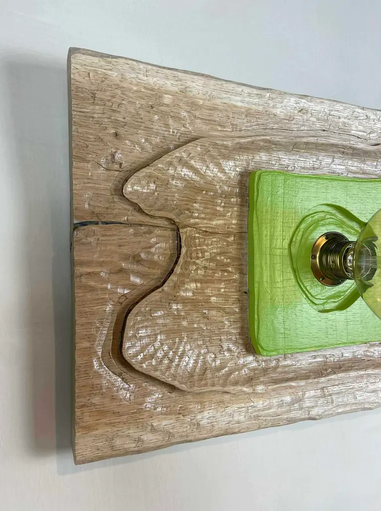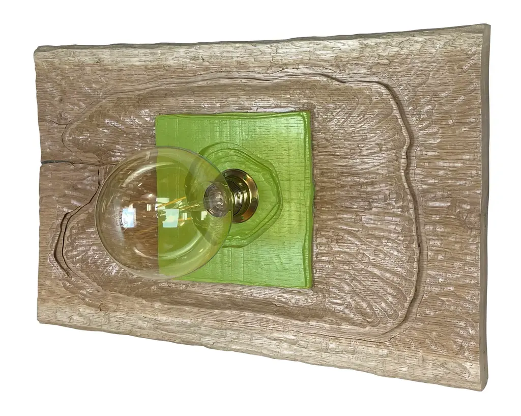 "Oasi Verde Chiaro" lamp by Pietro Meccani. Beautiful hand-carved oak wall lamp with colored parts. Designed in 1996, it is proposed again by the Meccani Design company. Signed by Maker, European Plug (up to 250V).