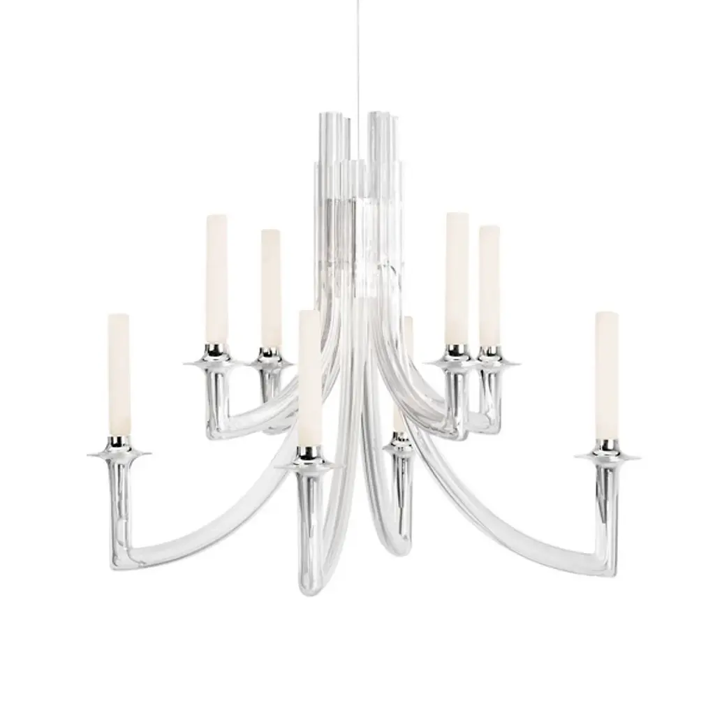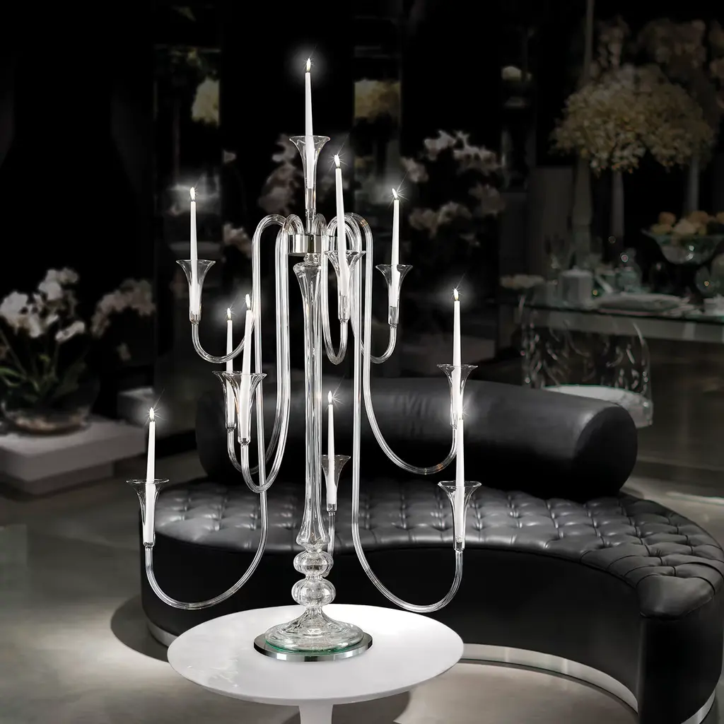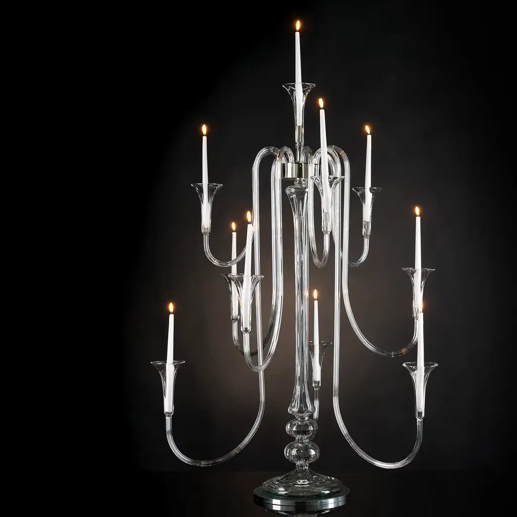 A stunning profile marked by sinuous and dynamic arms, this stunning candelabra will make a refined addition to a modern or eclectic decor. Deftly handcrafted of glass showcasing a natural transparent quality, each arm ends with a flared sconce that can hold a real or electronic candle (not included).