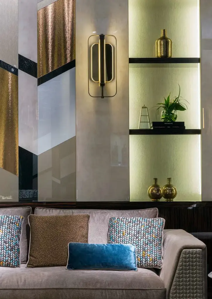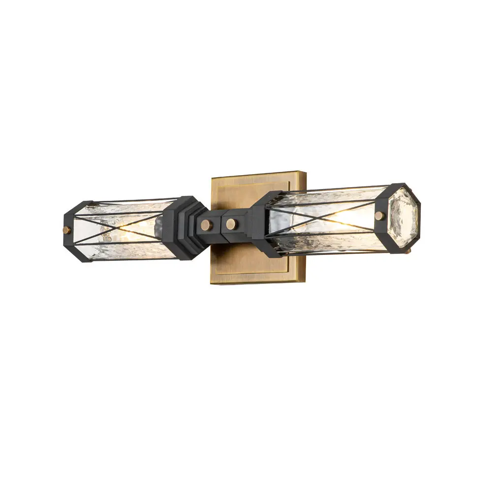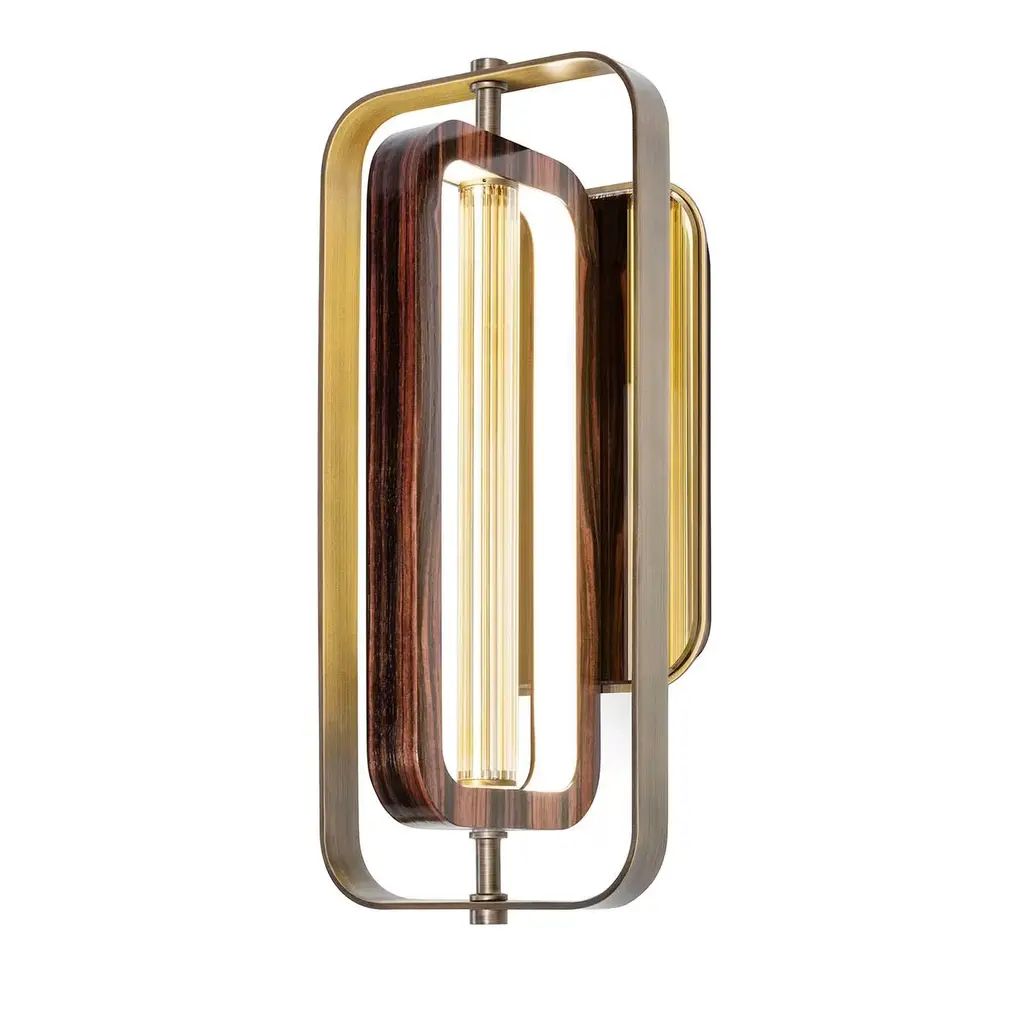 Odissey is a wall applique with bronzed metal frame and lined pirex glass. Thin metal bands in special finishes set this wall sconce apart. Geometric shapes that intersect at their ends with the central lighting system, slender and light.Lamp made in antique bronze finish brass. Decorative rings in brass with antique bronze and polished ebony finish. Decorative pyrex tube in the middle. Fixing base in bronzed decorative mirror.