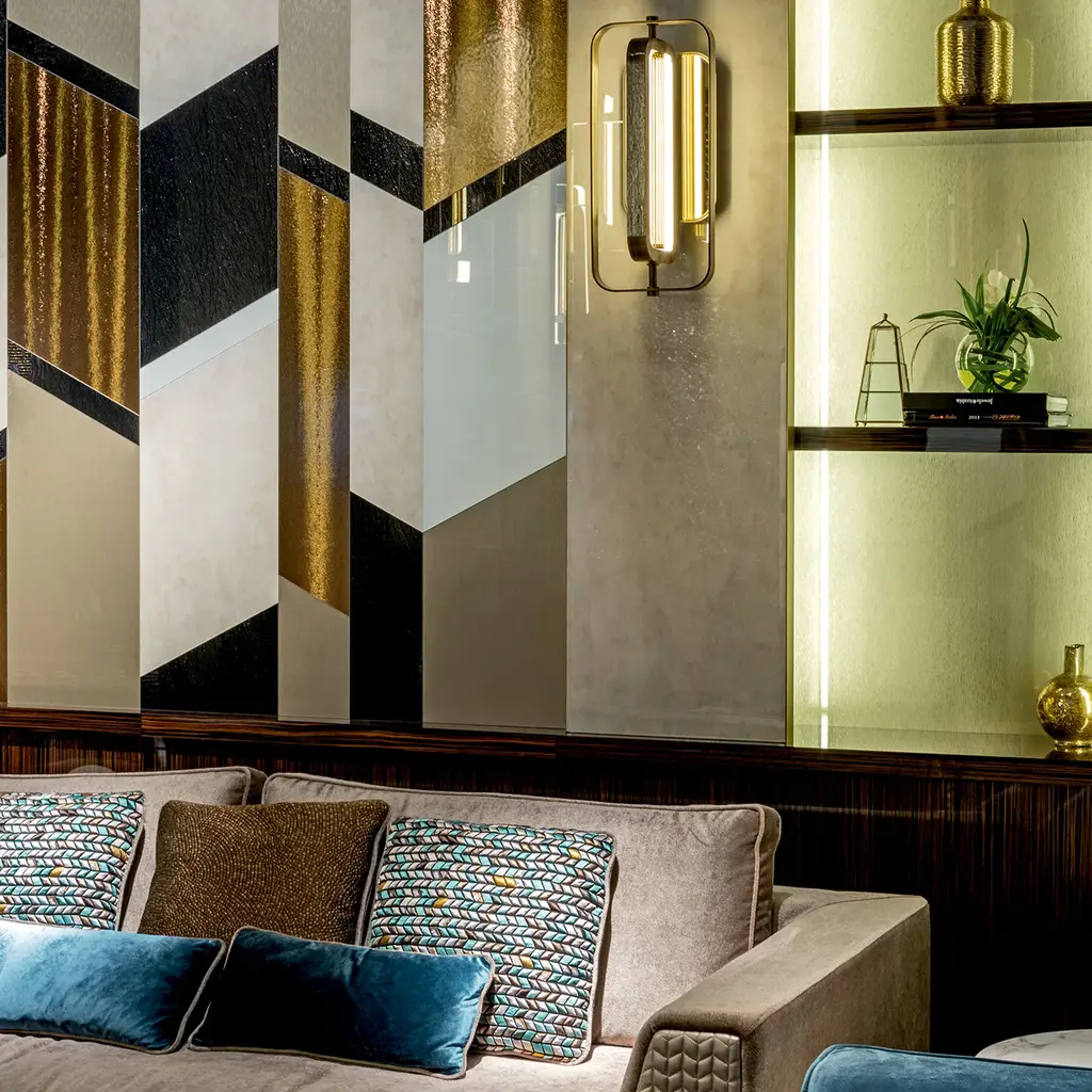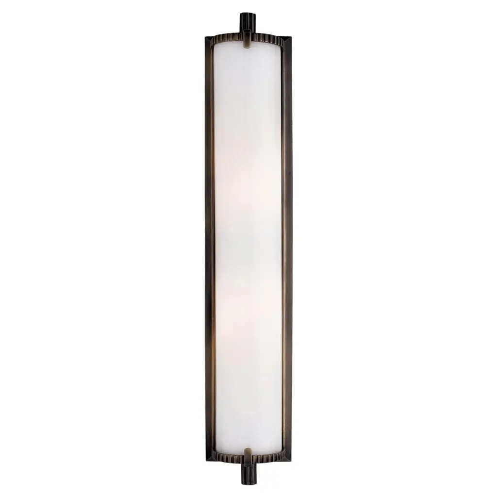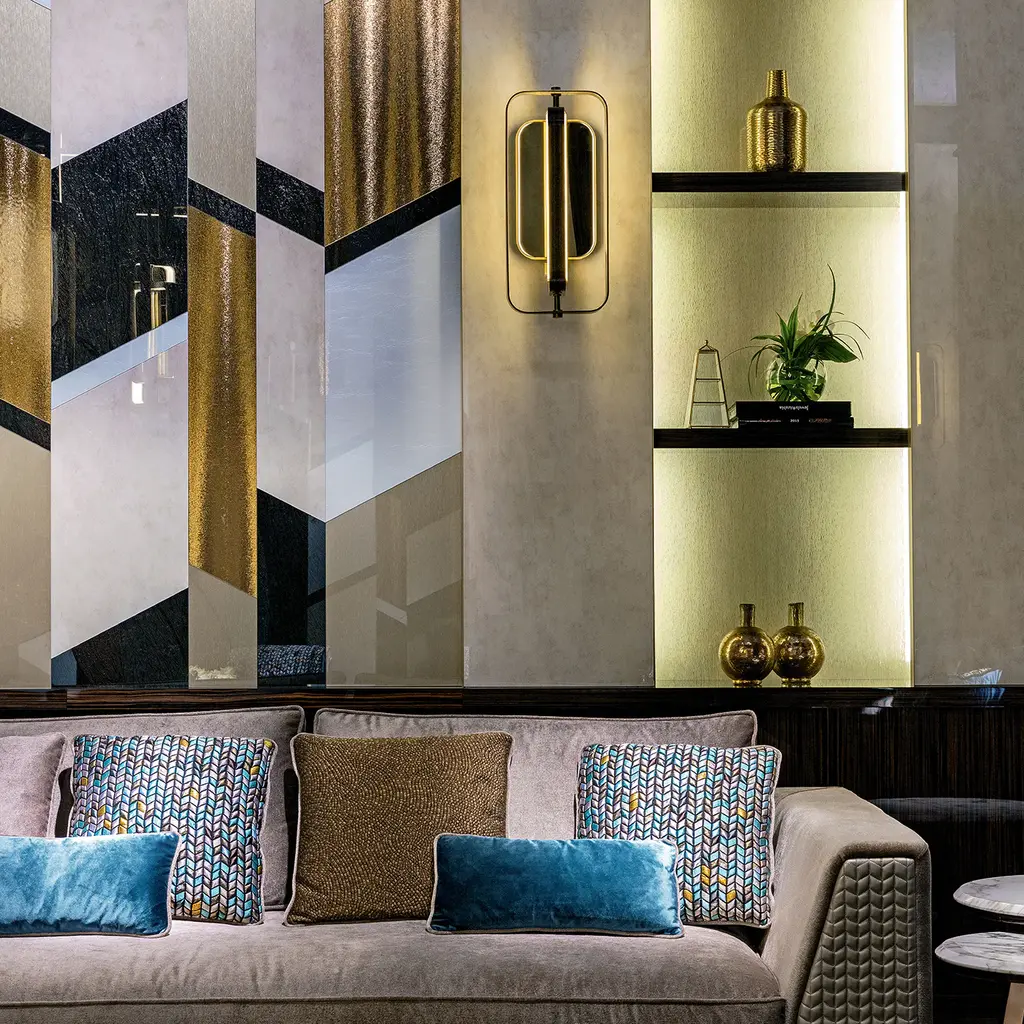 A well-balanced combination of materials and volumes creates a sense of movement and lightness in this exquisite sconce by Massimiliano Raggi. This splendid addition to a modern interior can be paired with the Odissey Pendant Lamp for a cohesive effect. The structure is in bronzed metal with a shade in ridged borosilicate glass. The base is in bronzed mirror, while precious glossy-finished ebony inserts add an organic accent to the piece. The bulb is an LED strip 16W with 3000K and 800 lumens. The voltage is 220 and can be changed upon request. This lamp has CE certification.