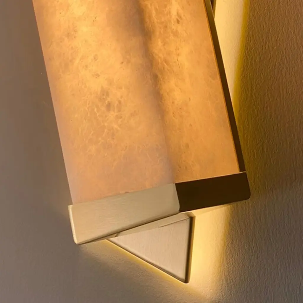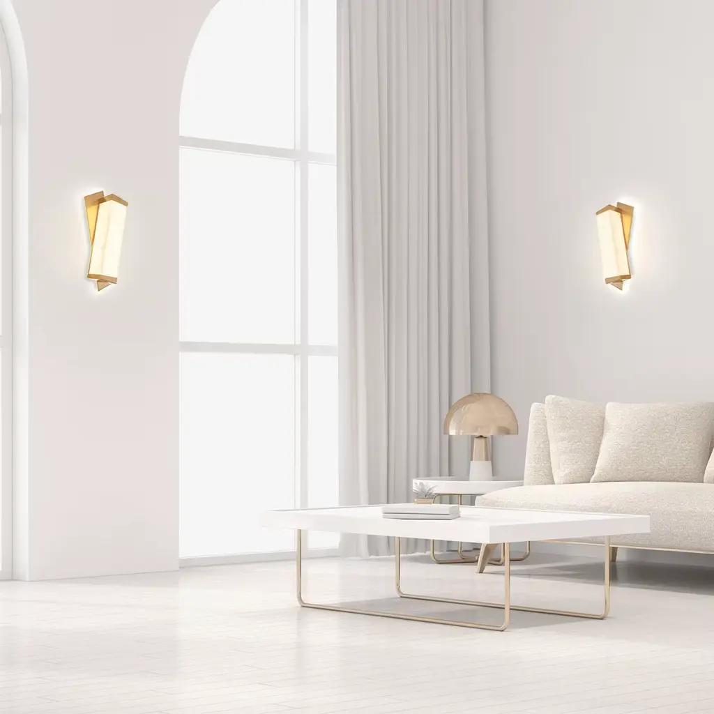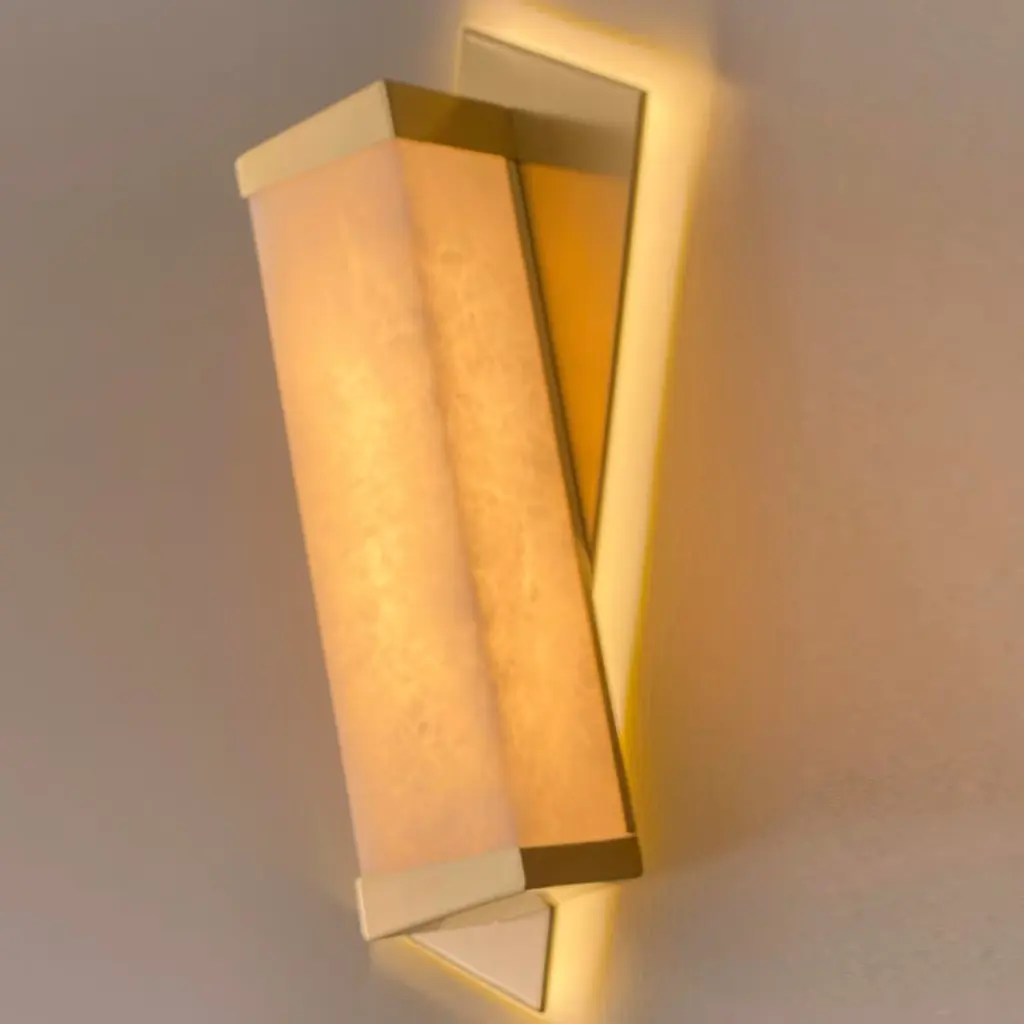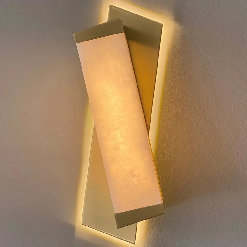 Wall sconce lamp Offset, with a 30’s flavor stressed by the alabaster diffuser and sharp geometric shapes. Led back lighting on the wall and the warm light diffused by the alabaster make this lamp a strong impact on the wall.