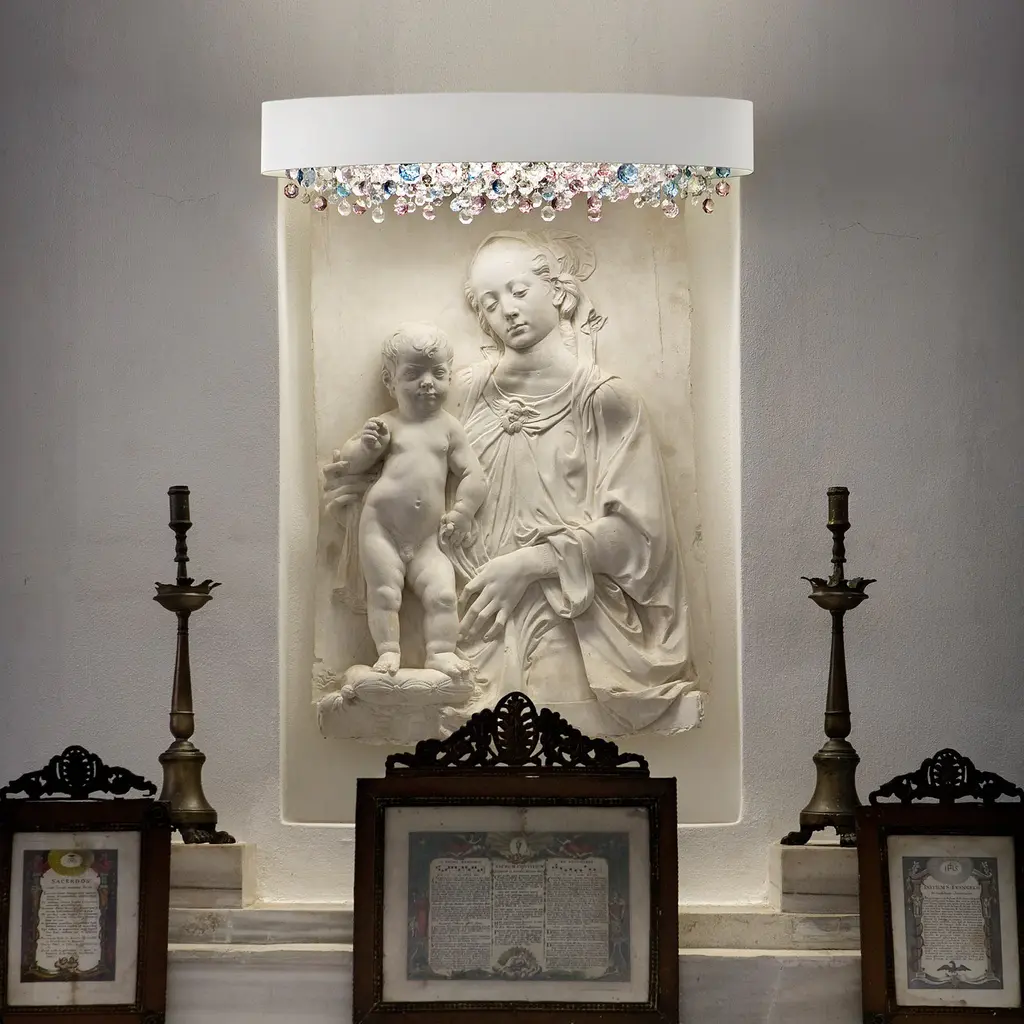 Indulge in the luxurious design of the Ola Wall Sconce from Masiero. A striking juxtaposition of metal and glass, this contemporary piece exudes elegance and sophistication. The cascading colored crystals and sleek frame create a mesmerizing effect, making it a perfect addition to any hallway, dining room, or walk-in closet. Elevate your home decor with this exquisite wall sconce. Highlights