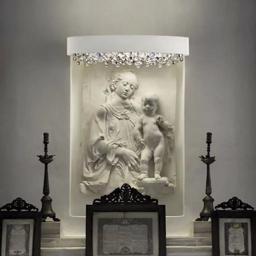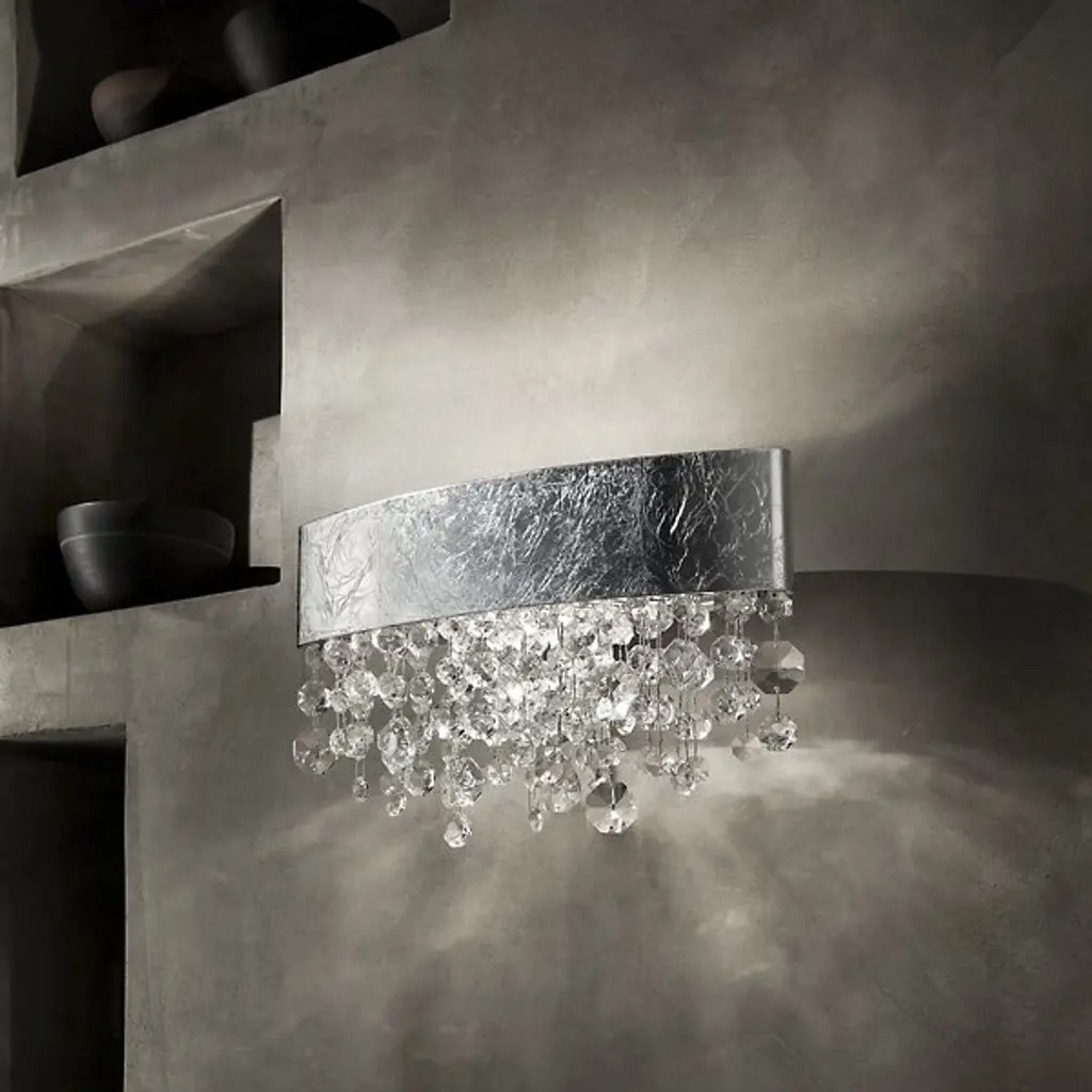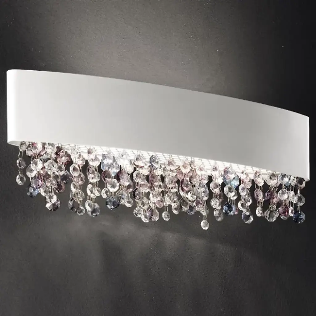 A contemporary mix of muscular metallics and gleaming gems, the Masiero Ola Wall Sconce features a continuous expanse of coated Italian glass strands spilling downward from its sleek frame. Each frame's finish is designed with its own individual assortment of cascading colored crystals. The different styling arrangements result in unique looks that would complement a wide range of interior spaces.