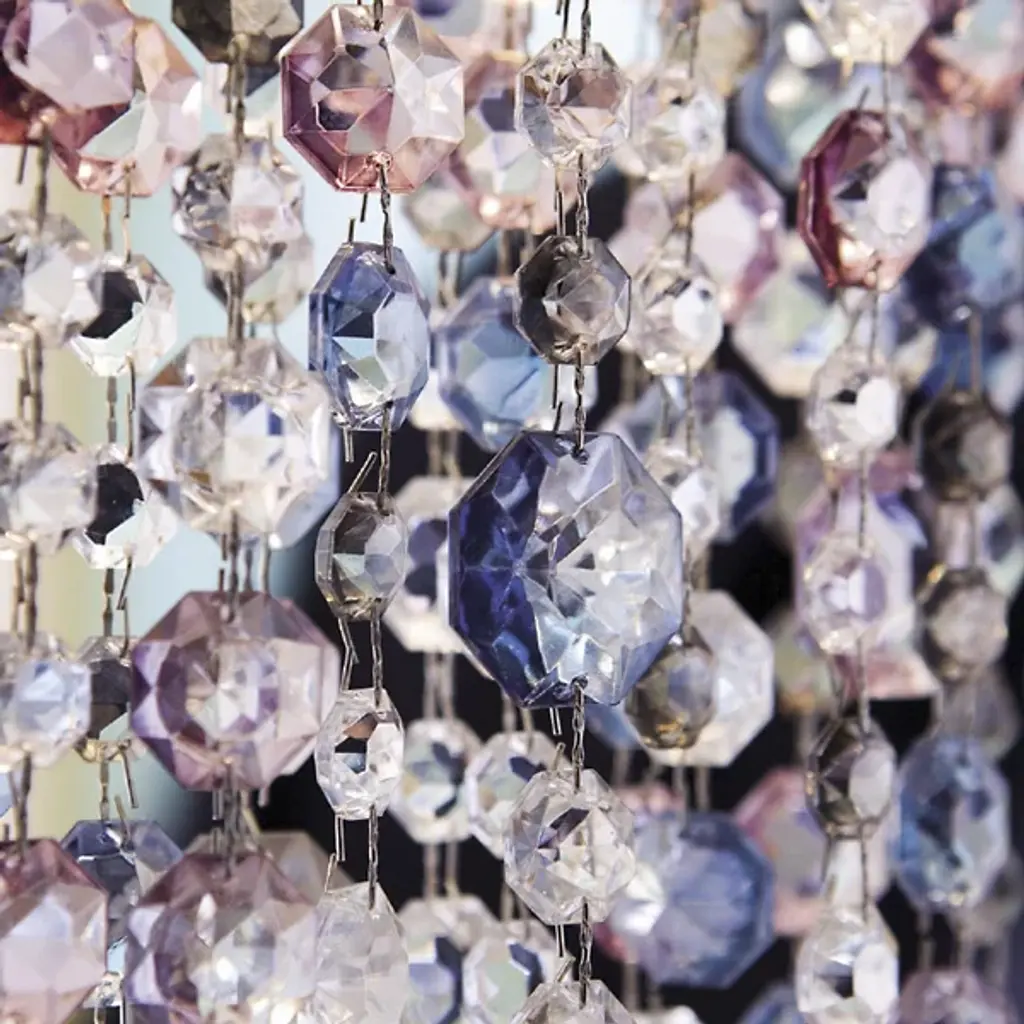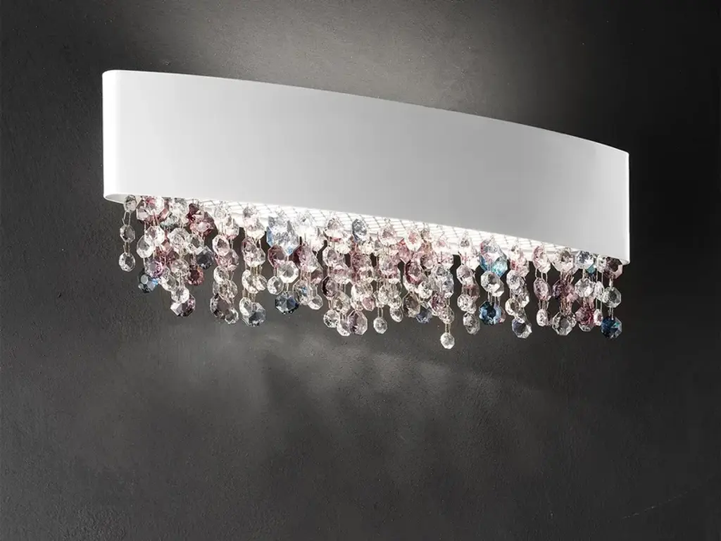 A contemporary mix of muscular metallics and gleaming gems, the Masiero Ola Wall Sconce features a continuous expanse of coated Italian glass strands spilling downward from its sleek frame. Each frame's finish is designed with its own individual assortment of cascading colored crystals. The different styling arrangements result in unique looks that would complement a wide range of interior spaces.
