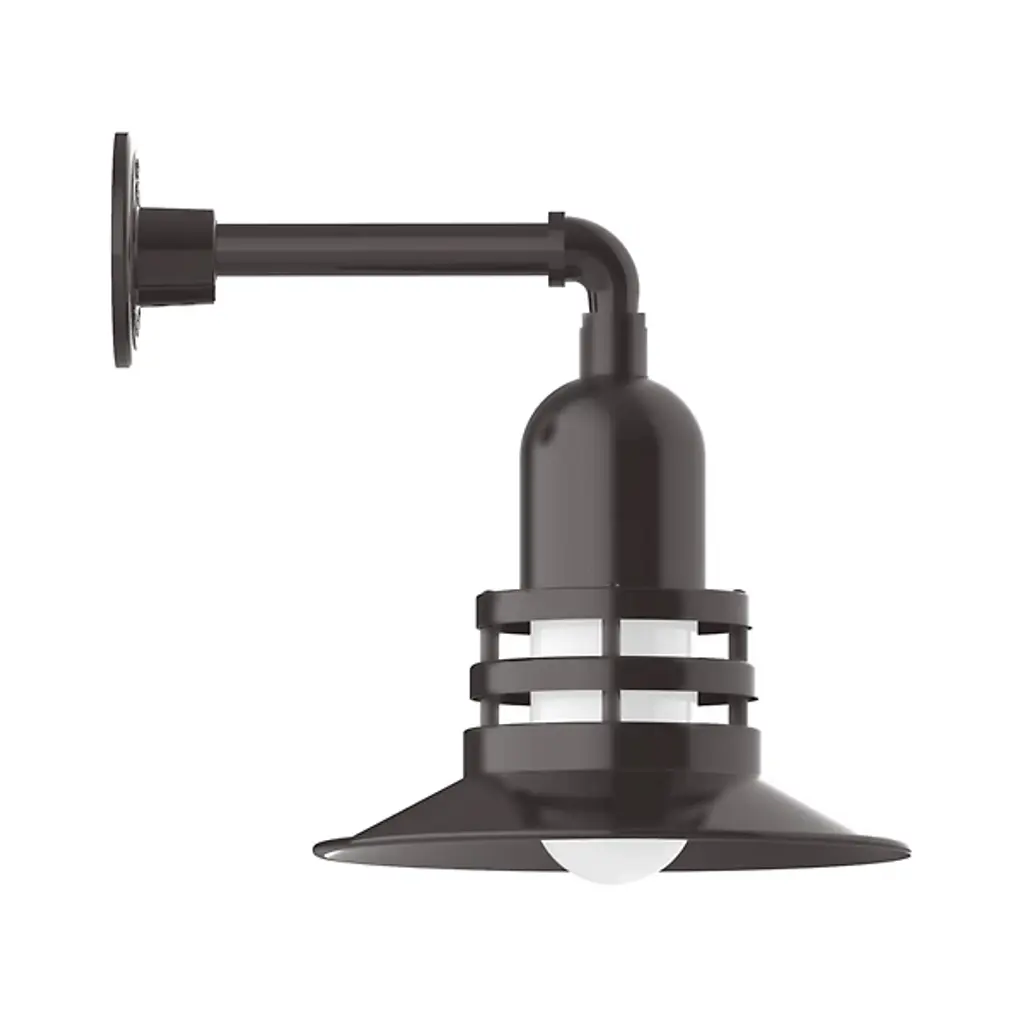 Make an unforgettable addition to your outdoor wall spaces with the arresting intricacy of the Olive Outdoor Straight Arm Wall Sconce from Alder & Ore. This retro-style fixture is inspired by industrial illumination from the Roaring 20s, and its robust metal fittings tell the tale, extending a single stem and downward-curving accent from a sleek disc wall plate to a complex shade crafted from robust aluminum. The lamping is wet-listed and contained within a Weathertight jar that blocks bright glare, exchanging it for an elegant ambiance that spills down from the flared, shallow shade and out through the horizontal grille cuts in the cylindrical housing above it.