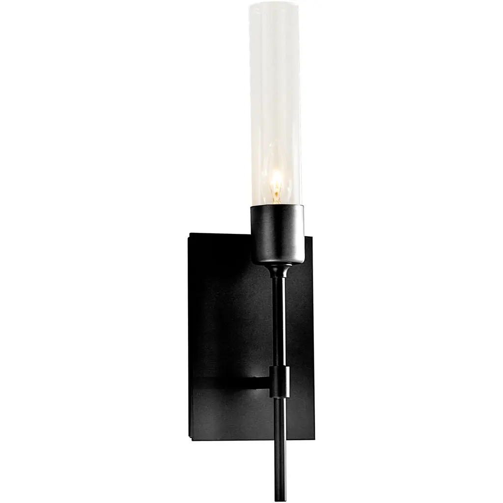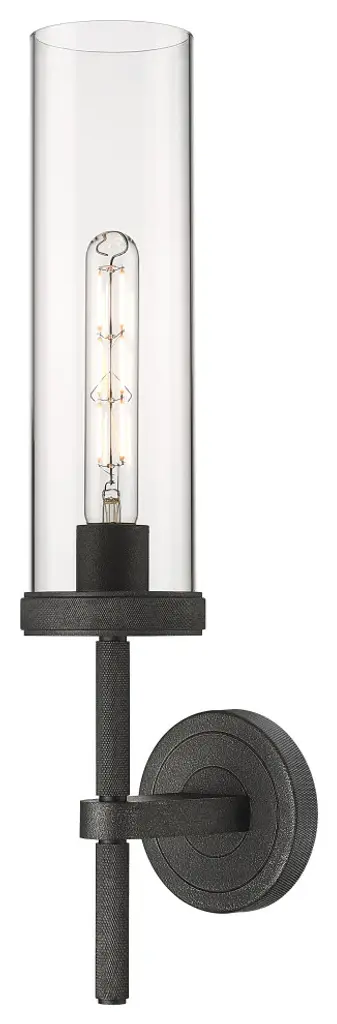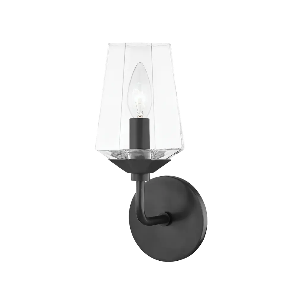 Traditional style with an edge, Olivia's long metal arms extend down giving the piece a torch-like feel. The Belgian linen shades cast a candle-like glow instantly soothing any space. Wall sconce also available with a crackle clear glass shade.