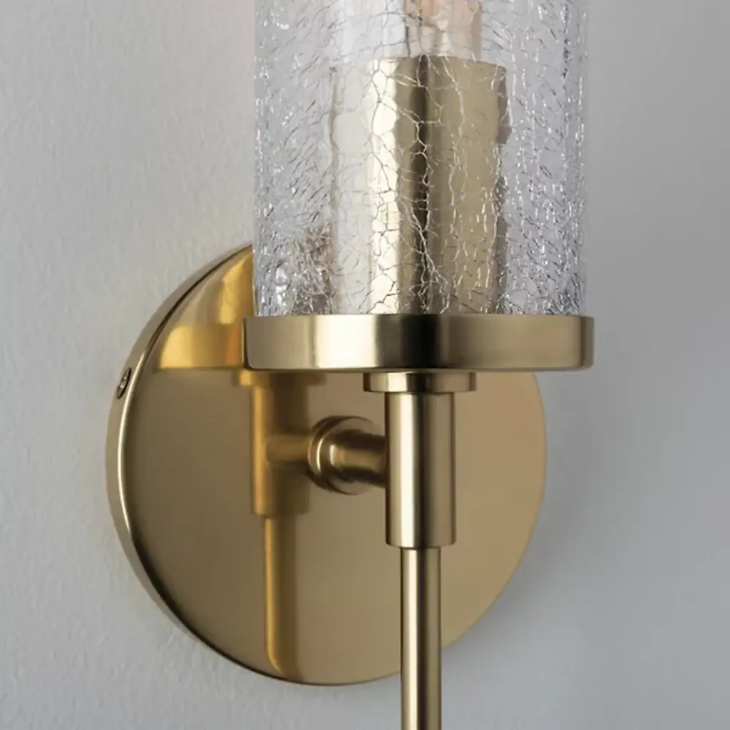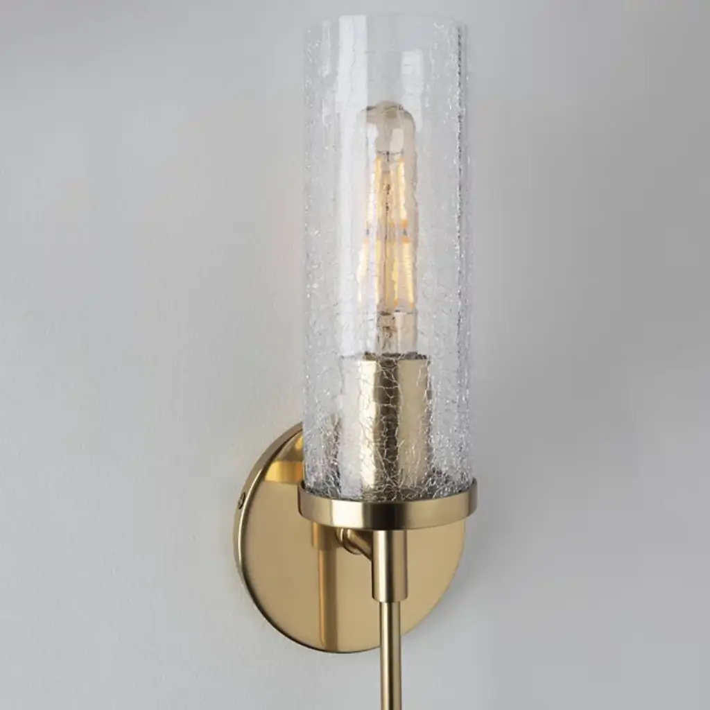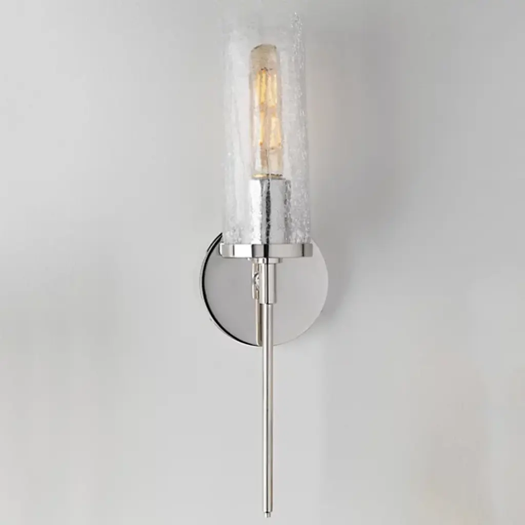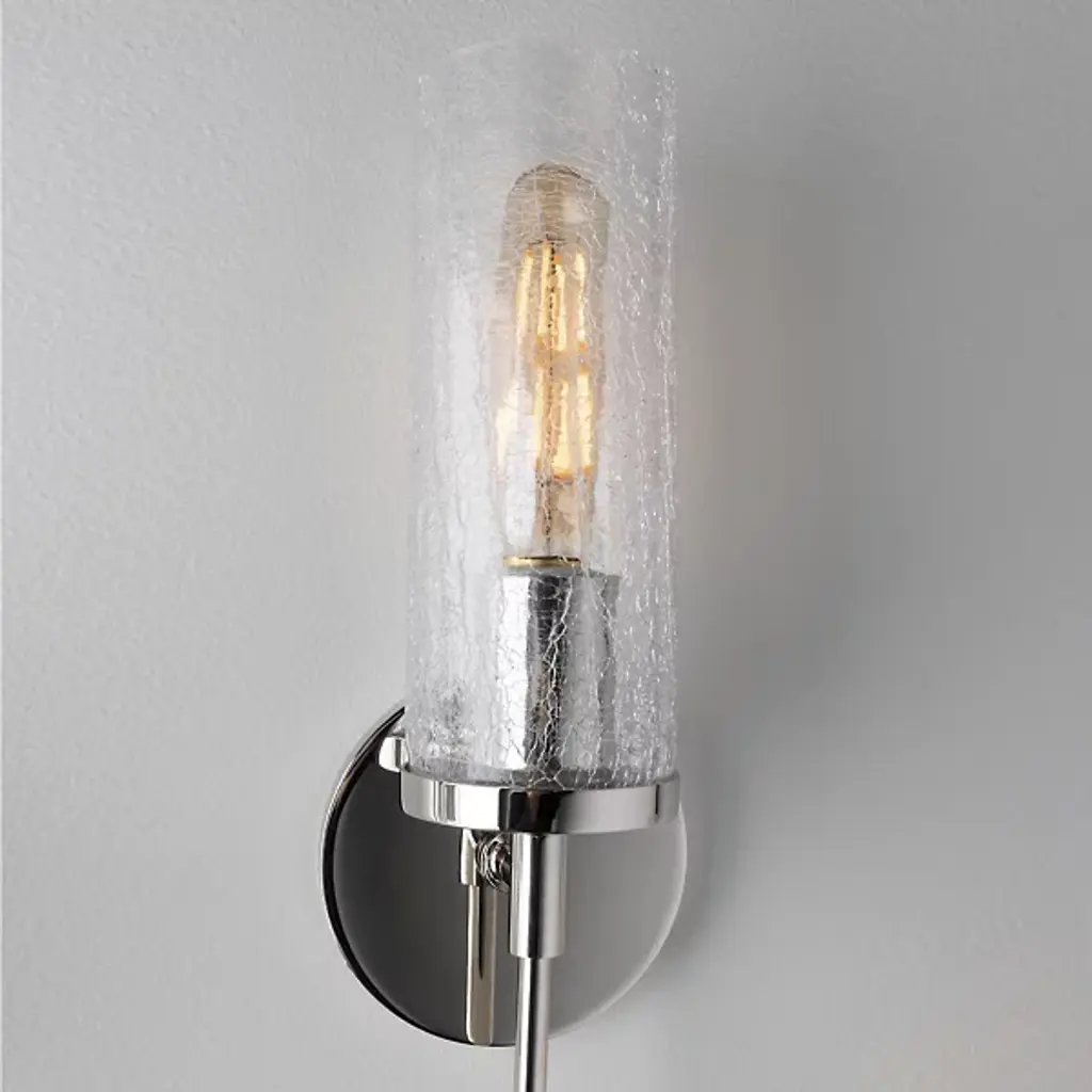 The Mitzi Olivia Glass Wall Sconce offers a vintage touch while complementing your existing contemporary style. The incandescent bulb shines ambient light through a Crackle Clear Glass diffuser, giving the light a fashionable texture. The narrow stem of the Steel frame creates a balanced symmetry, with the body, shade and bulb delivering a strong, vertical design.