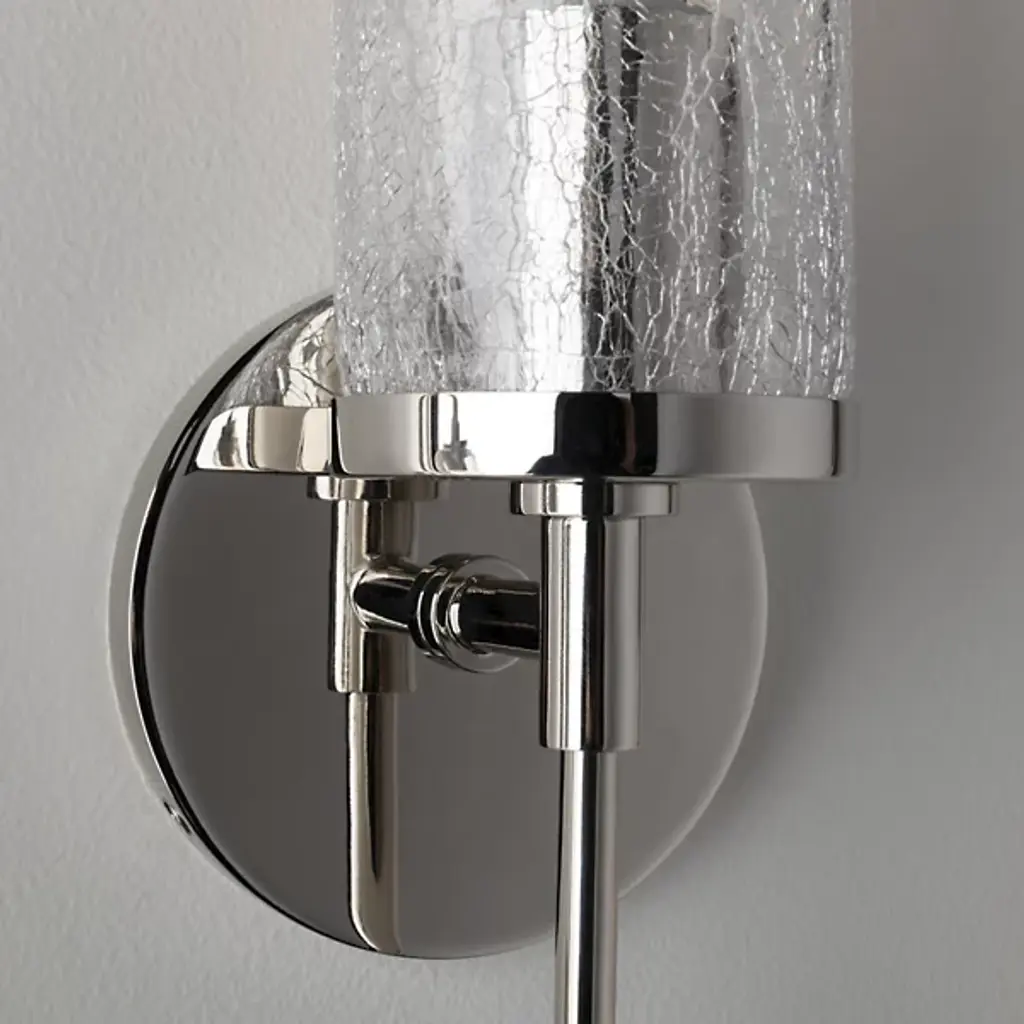 The Mitzi Olivia Glass Wall Sconce offers a vintage touch while complementing your existing contemporary style. The incandescent bulb shines ambient light through a Crackle Clear Glass diffuser, giving the light a fashionable texture. The narrow stem of the Steel frame creates a balanced symmetry, with the body, shade and bulb delivering a strong, vertical design.
