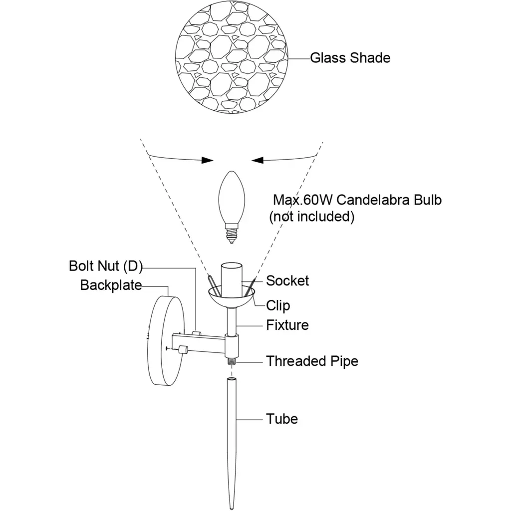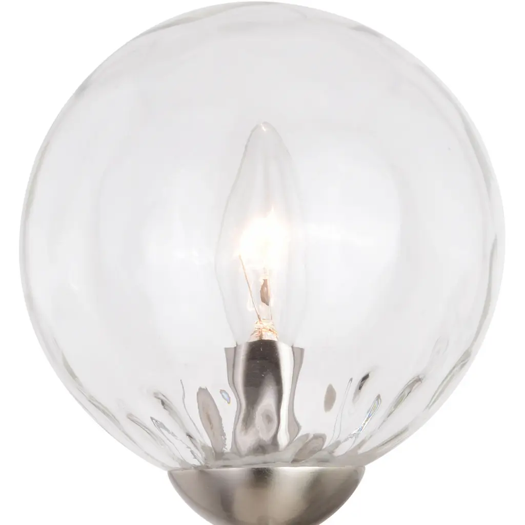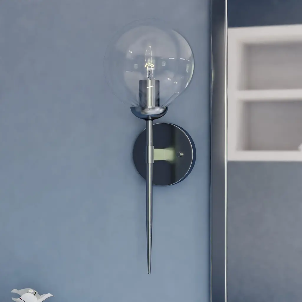 The Olson is a new take on a familiar mid-century modern design. The dimpled clear globe glass shade is supported by a fresh satin nickel rod. Combine that with a vintage Edison style filament bulb to complete the look. This wall sconce is ideal for bathrooms, hallways, stairways, foyers, and more.
