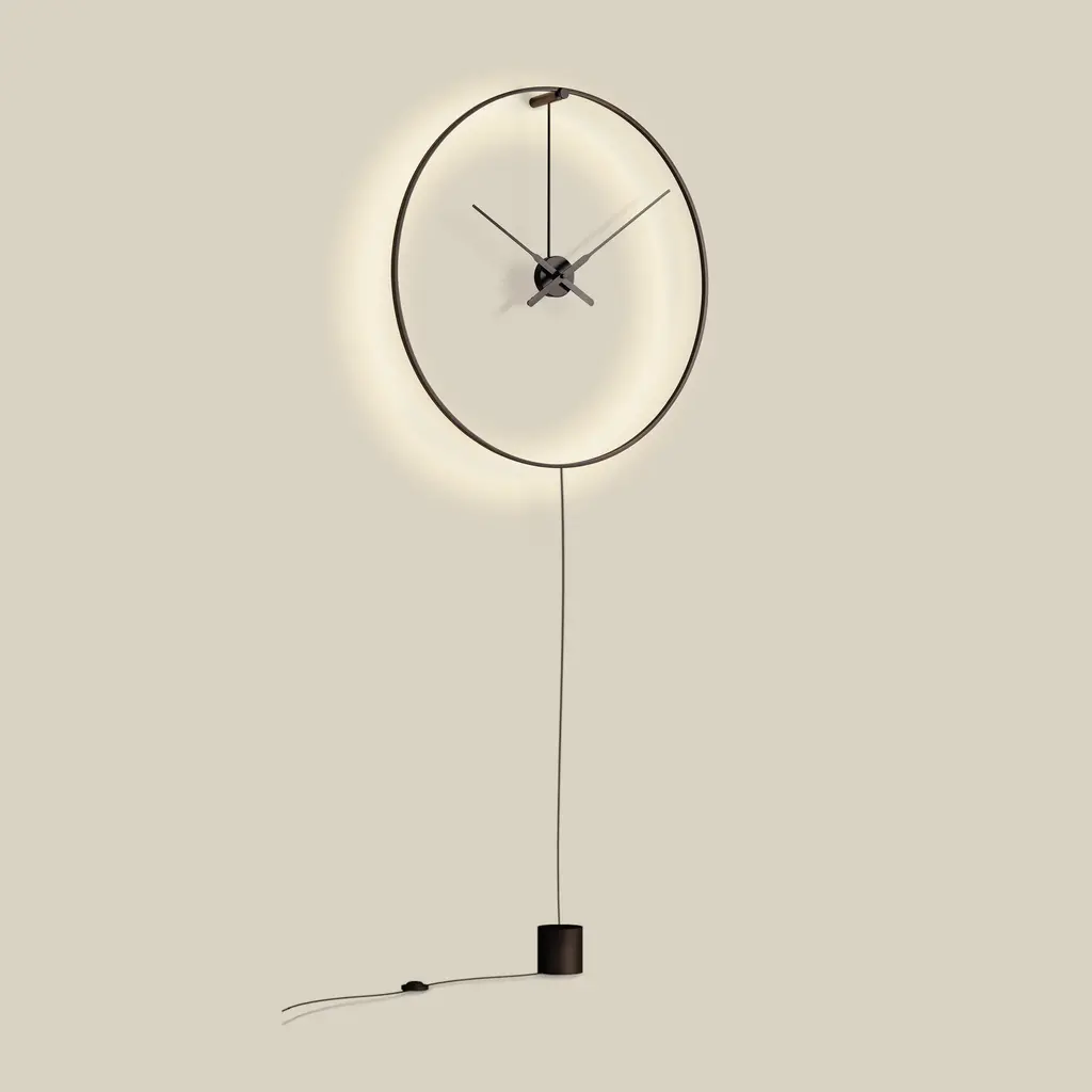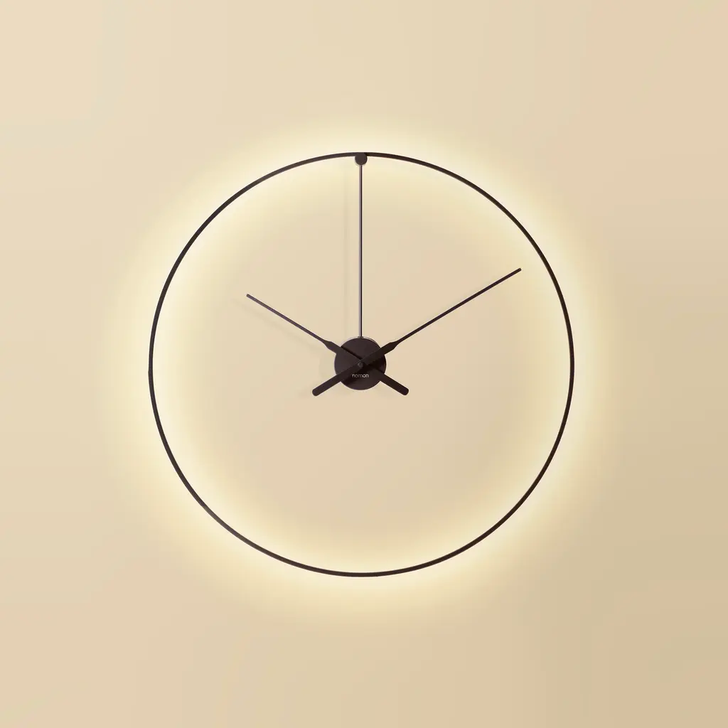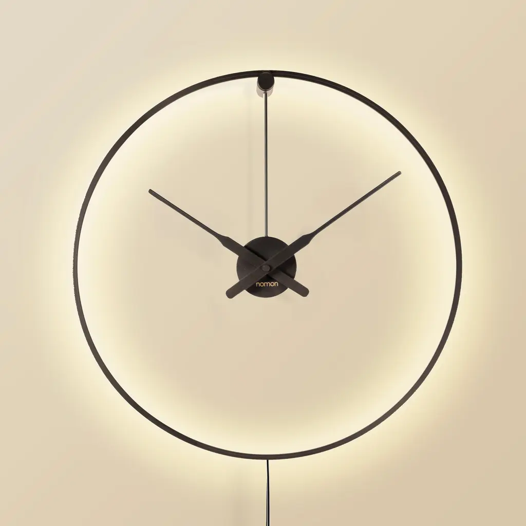 The Ombra Wall Clock from Nomon adds a touch of sophistication and luxury to any modern space. This elegant clock doubles as a wall lamp, emitting a warm and charming ambient light from its sleek black metal ring. Available in both plug-in and hardwired versions, Ombra is the perfect decorative piece for offices, restaurants, and homes. Highlights