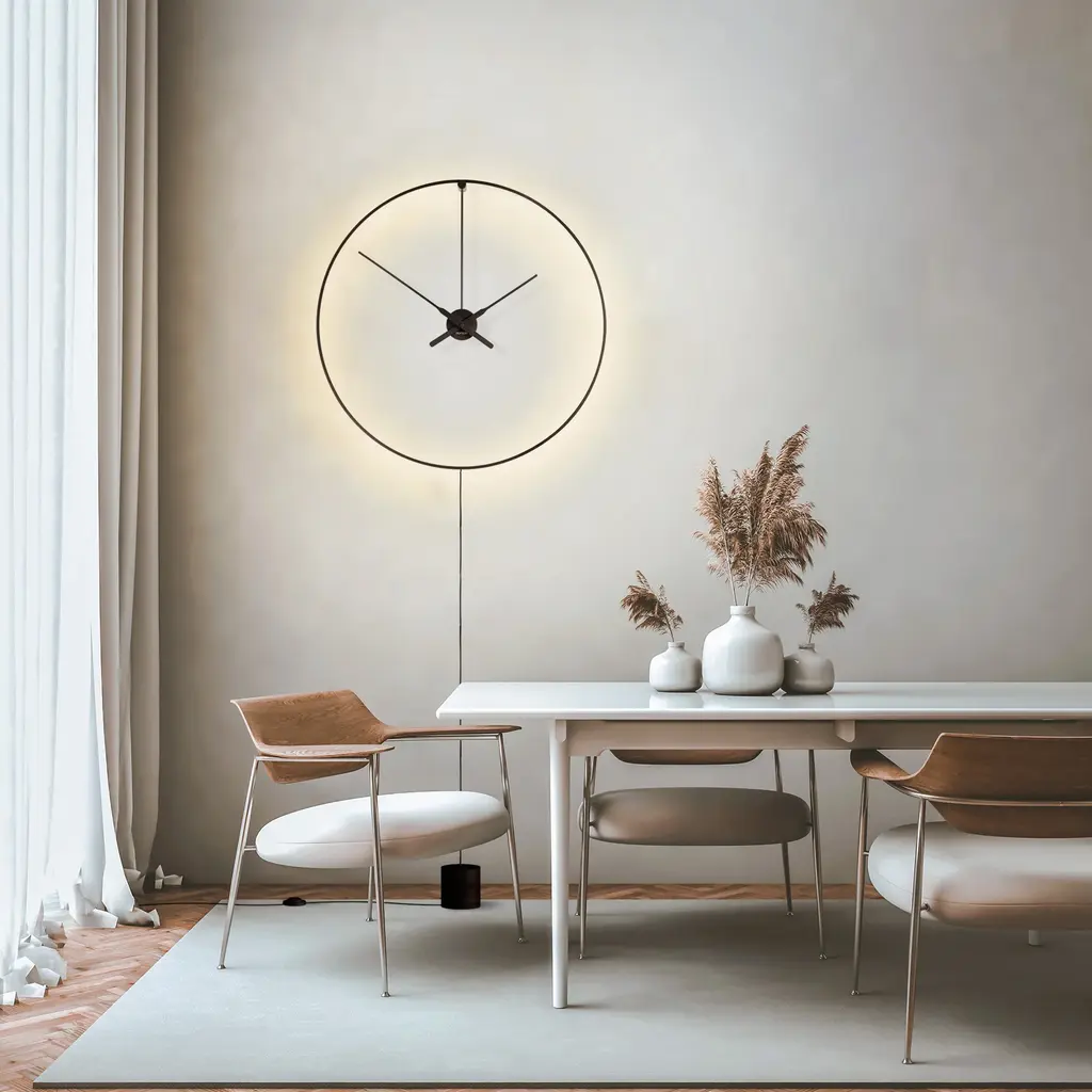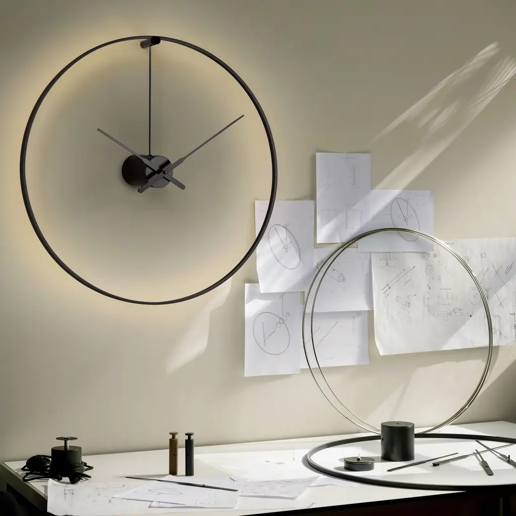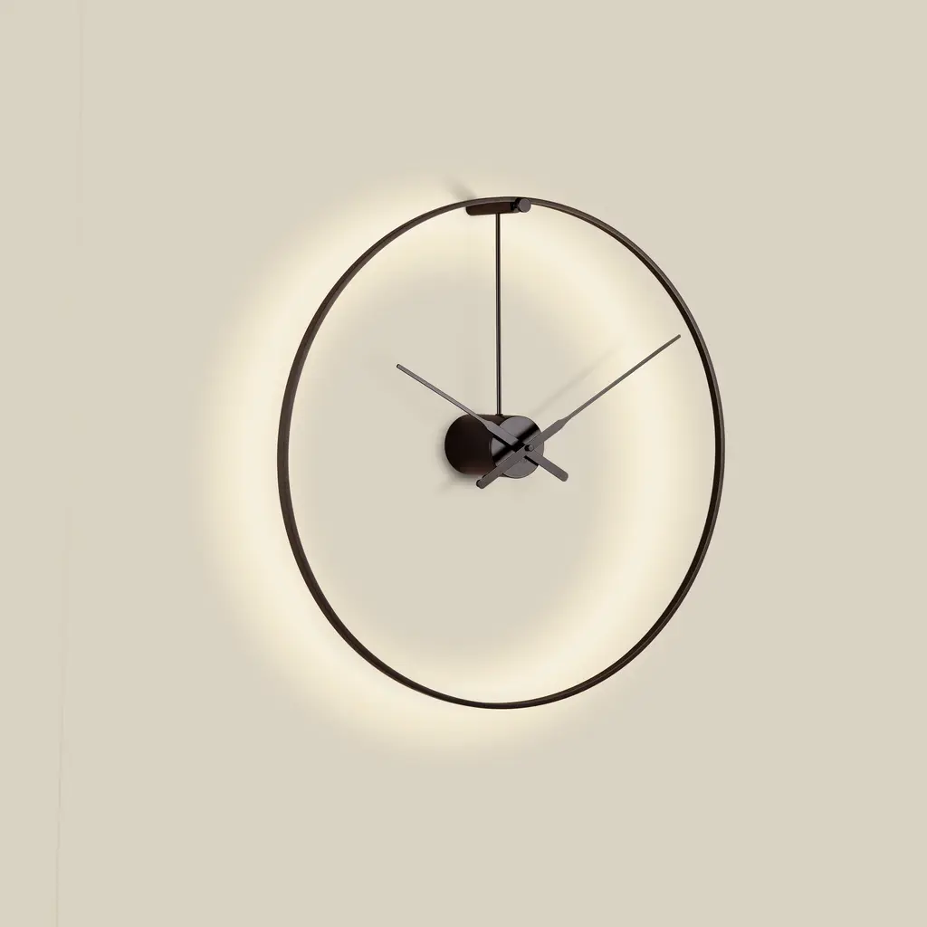 The Ombra Wall Clock from Nomon adds a touch of sophistication and luxury to any modern space. This elegant clock doubles as a wall lamp, emitting a warm and charming ambient light from its sleek black metal ring. Available in both plug-in and hardwired versions, Ombra is the perfect decorative piece for offices, restaurants, and homes. Highlights