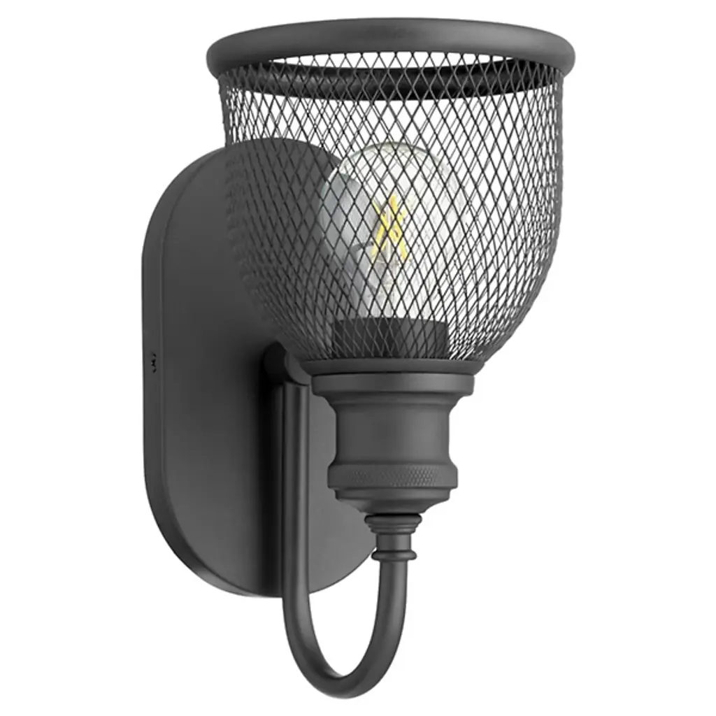 The Omni Wall Sconce by Quorum International boasts a fresh look while alluding to classic vintage pieces. Supported by an oval-shaped wall mount, a slender arm curves forward to support a bulb socket with knurled detailing. A metal screen forms the fixture’s bell shade, which surrounds a single incandescent lamp that sends its warm light through the intricate patterning. A bold metal trim lines the shade’s rim, offering a fresh contrast to its texture and enhancing its contemporary look.