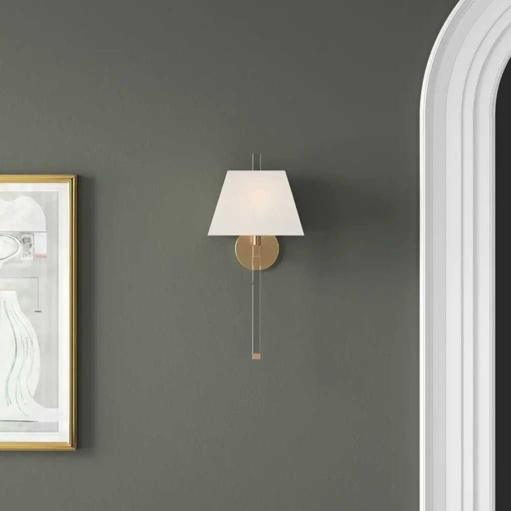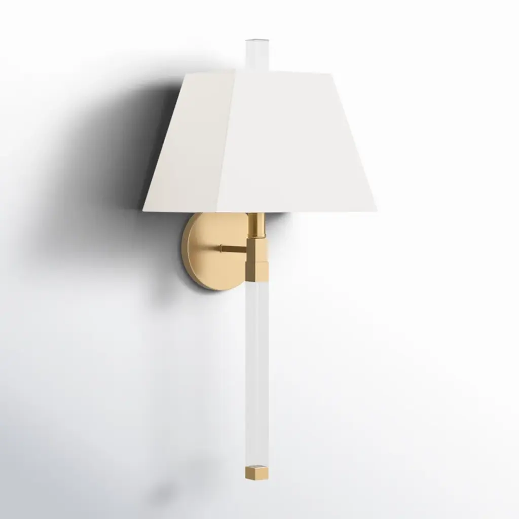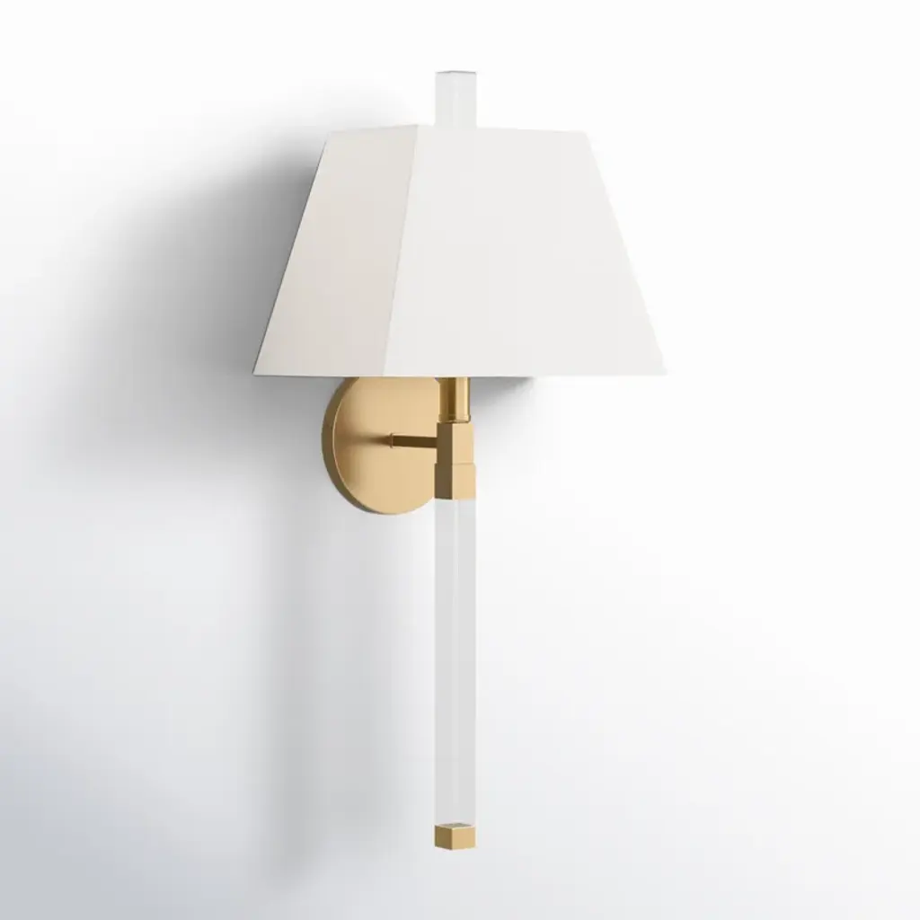 Versatile enough to add to just about any space, this armed sconce adds a little sparkle and shine to your wall. This hardwired fixture is made from metal and features a clear rod body that extends from a circular backplate in the finish of your choice. Inside the tapered white fabric shade, this sconce accommodates a single 60W incandescent bulb (sold separately). For added versatility, this sconce is safe to use in damp locations and compatible with dimmer switches.