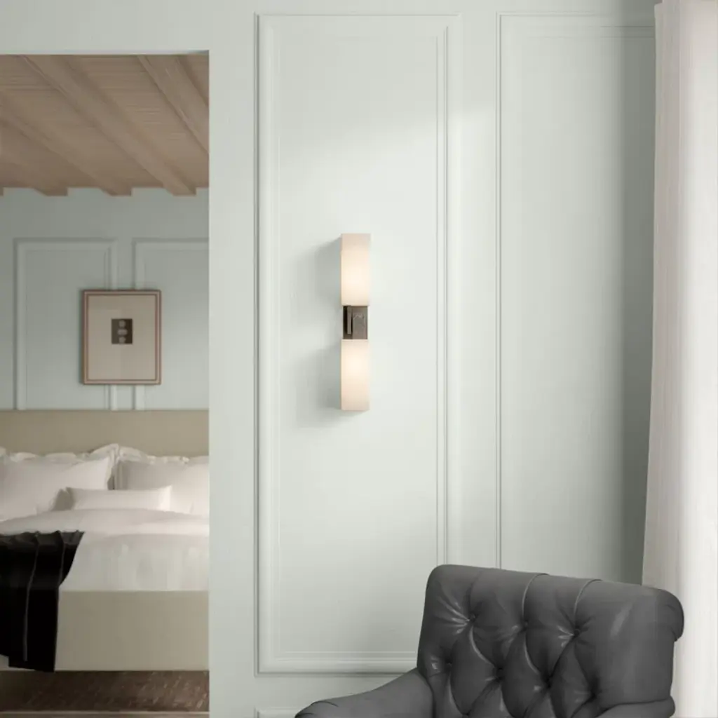 Hand-hammered steel bars barely brush against each other to unify the elements of this wall sconce. Simple rectangular glasses counterbalance each other on either side of the steel center. Forged and formed here in Vermont, each piece is unique.