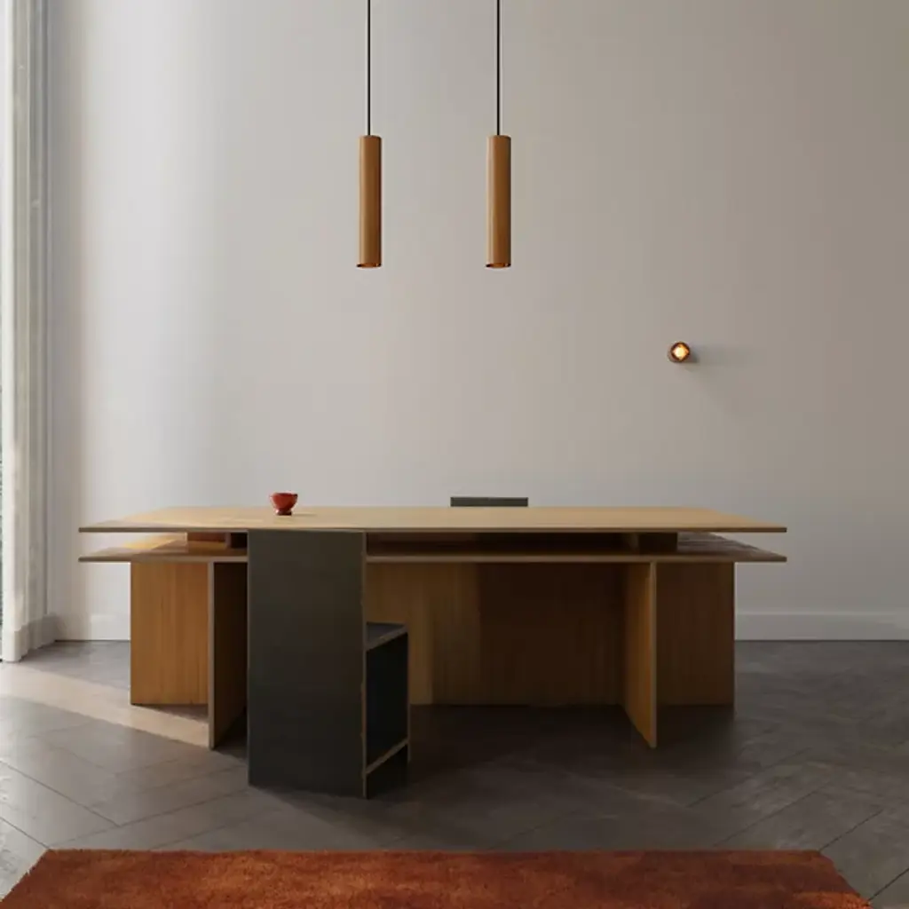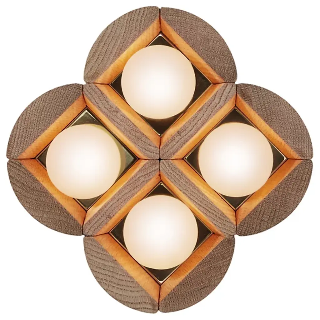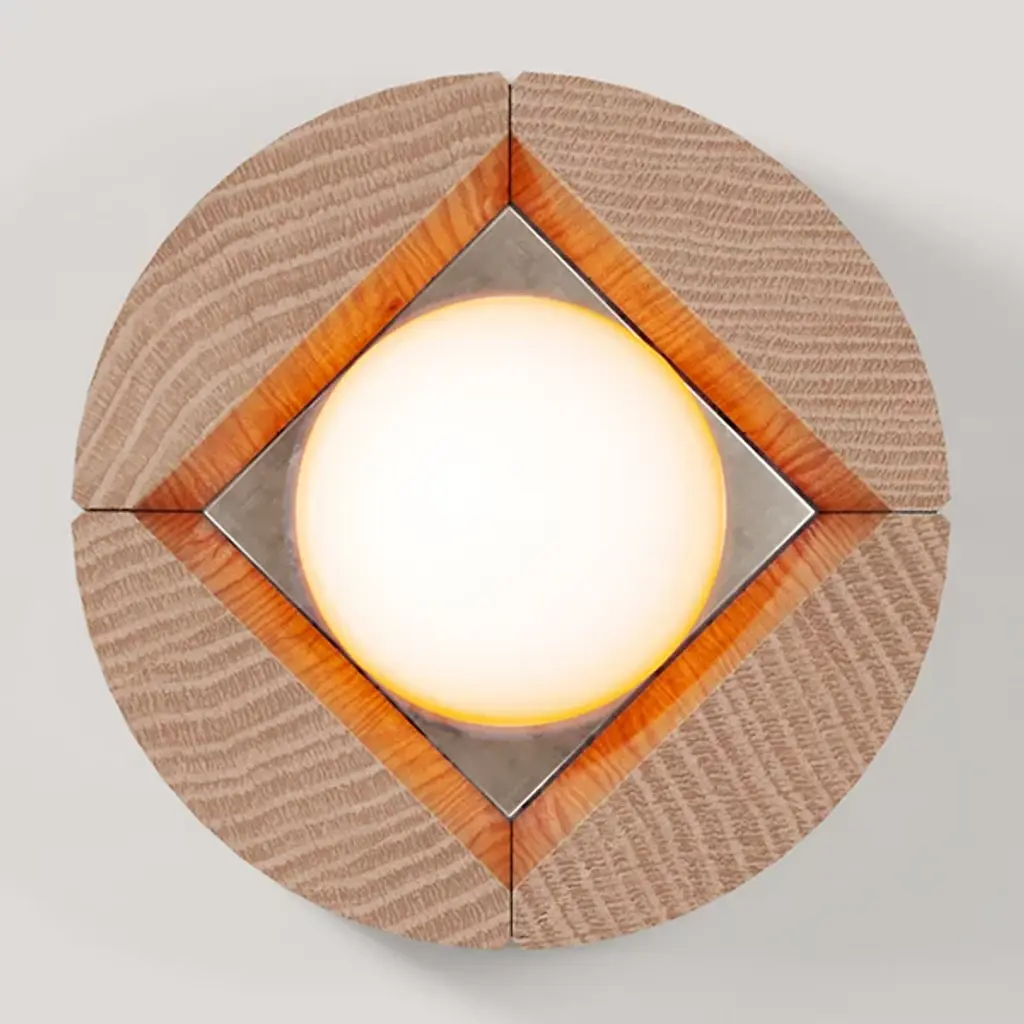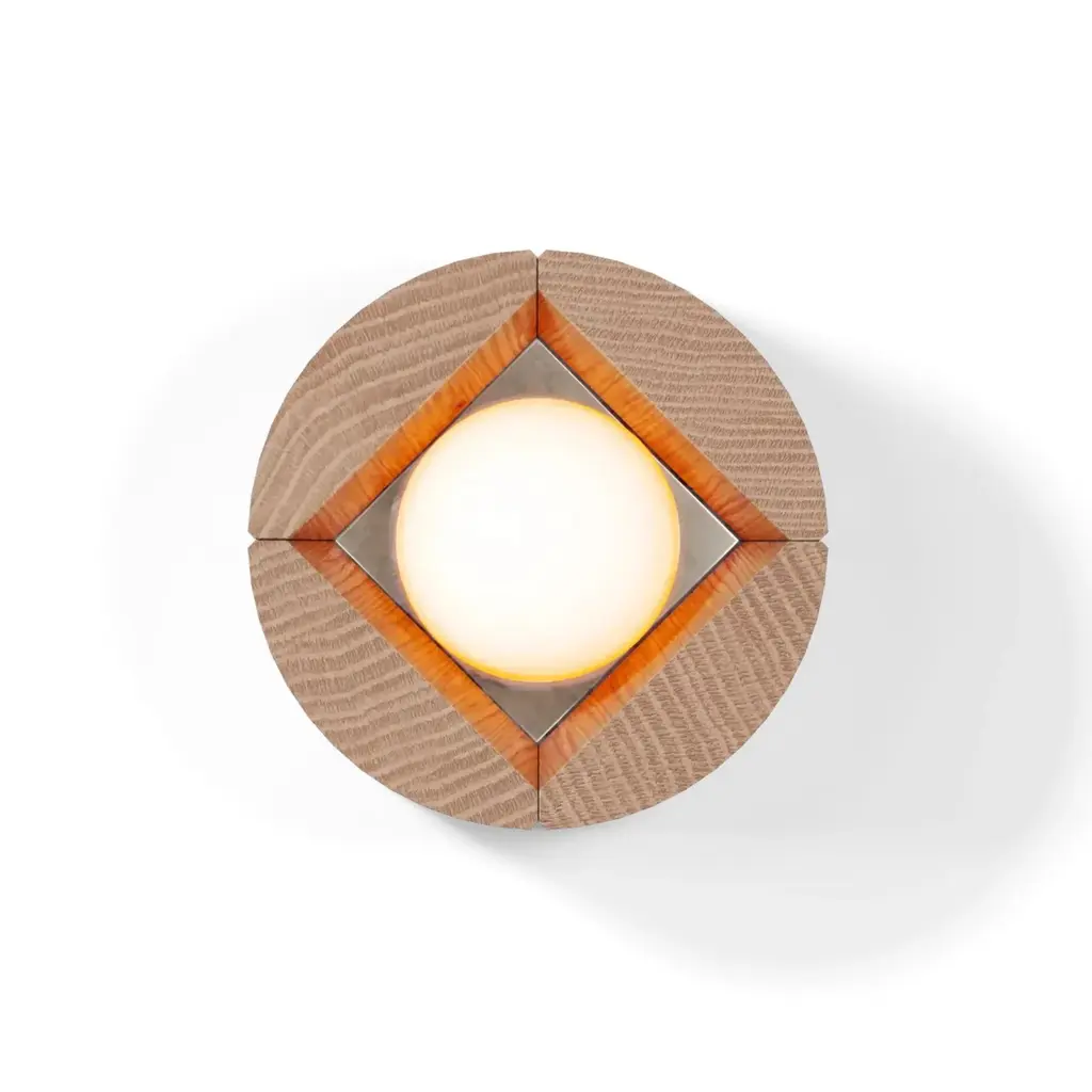 A square sculpture made from circular elements, produced with elegant intricacy. The One Dot Wall Sconce from Stickbulb combines sustainably sourced or reclaimed wood elements, creating a square pocket with strong lamping beneath a glass diffuser shade. The fixture is ADA-compliant, nestled close to the wall, creating a contrast of light and shadow as it salutes the Stickbulb design principles of modular systems and sustainable manufacturing from their New York Studio.