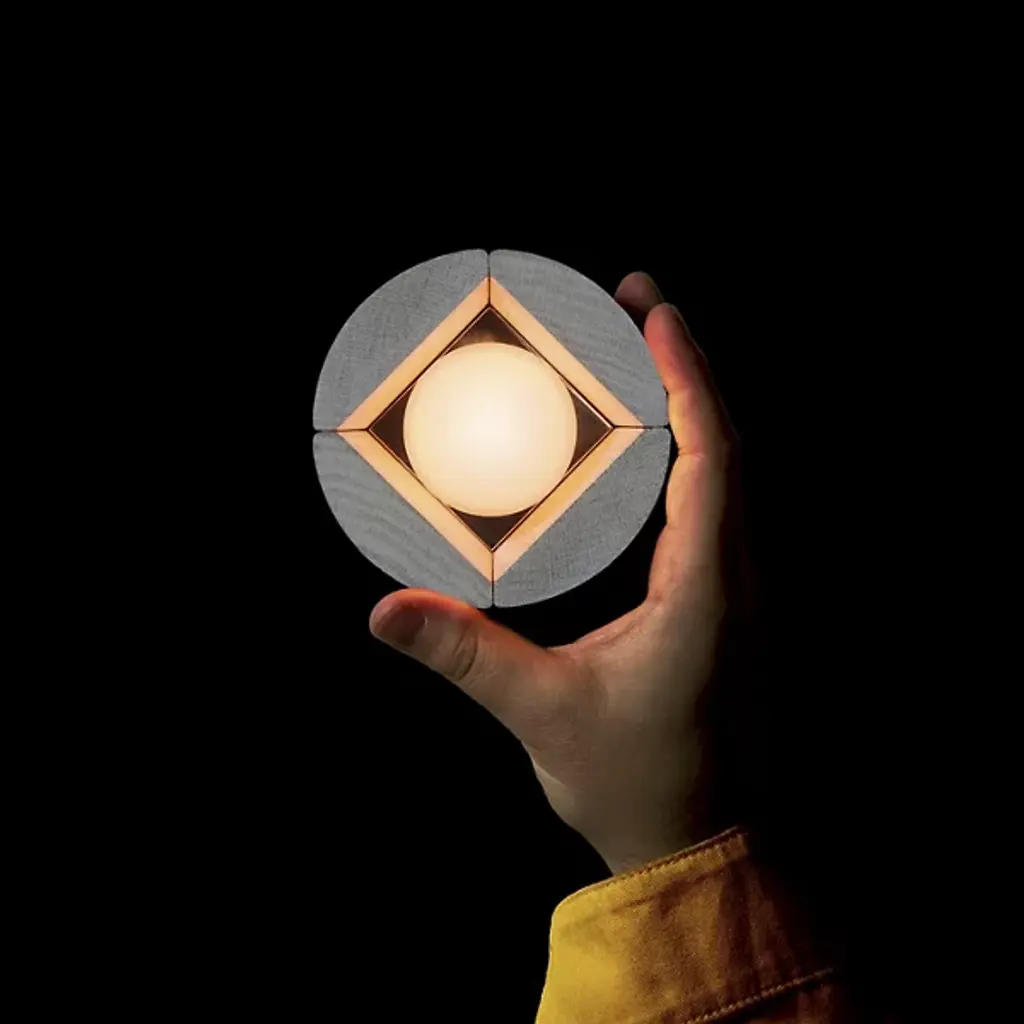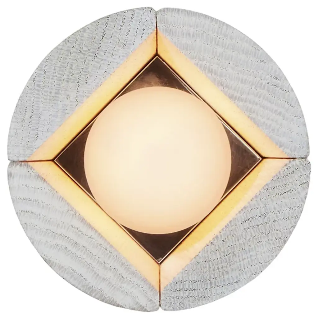 A square sculpture made from circular elements, produced with elegant intricacy. The One Dot Wall Sconce from Stickbulb combines sustainably sourced or reclaimed wood elements, creating a square pocket with strong lamping beneath a glass diffuser shade. The fixture is ADA-compliant, nestled close to the wall, creating a contrast of light and shadow as it salutes the Stickbulb design principles of modular systems and sustainable manufacturing from their New York Studio.