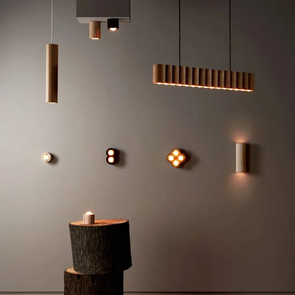 A square sculpture made from circular elements, produced with elegant intricacy. The One Dot Wall Sconce from Stickbulb combines sustainably sourced or reclaimed wood elements, creating a square pocket with strong lamping beneath a glass diffuser shade. The fixture is ADA-compliant, nestled close to the wall, creating a contrast of light and shadow as it salutes the Stickbulb design principles of modular systems and sustainable manufacturing from their New York Studio.