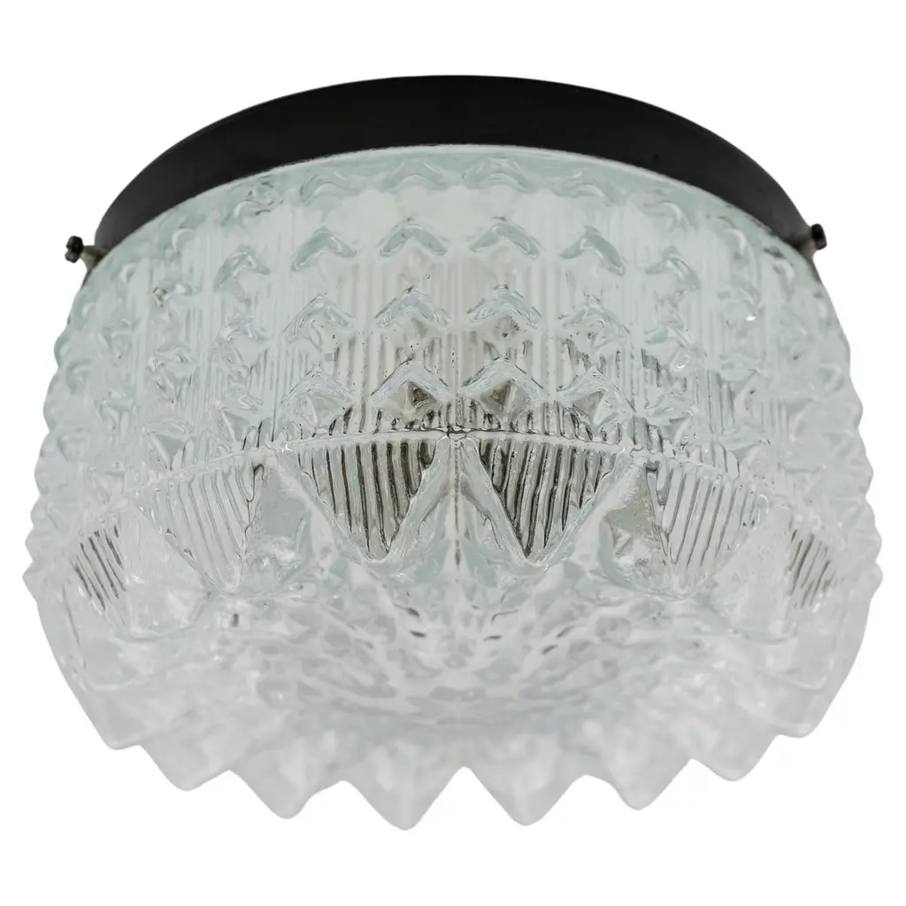 One of five square modernist flush mount light fixtures by Glashütte Limburg, manufactured in Mid-Century, circa 1970 (1960s - 1970s). A black lacquered metal backplate holds a geometric textured art glass. Labelled. Excellent condition, unused original old stock.Each lamp takes one medium screw base bulb. It can be used as wall or ceiling light fixture.There are five lights available. The price is per light. The lamps are sold singly, as pair or as set of three, four or five.Shipping cost depends of number of ordered items.
