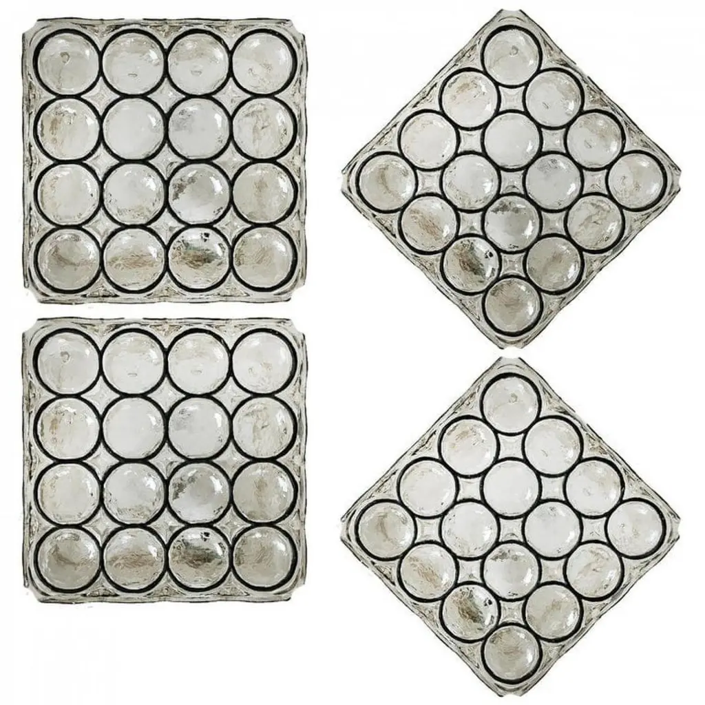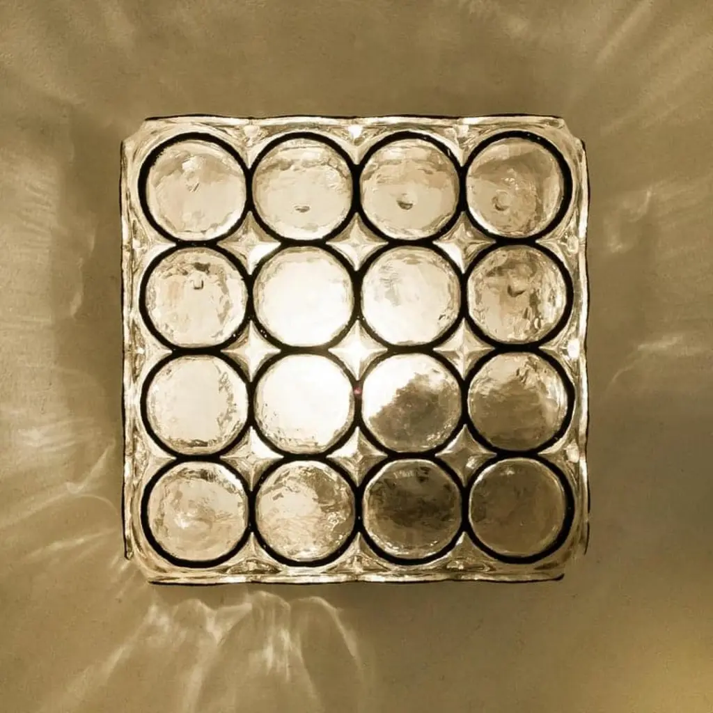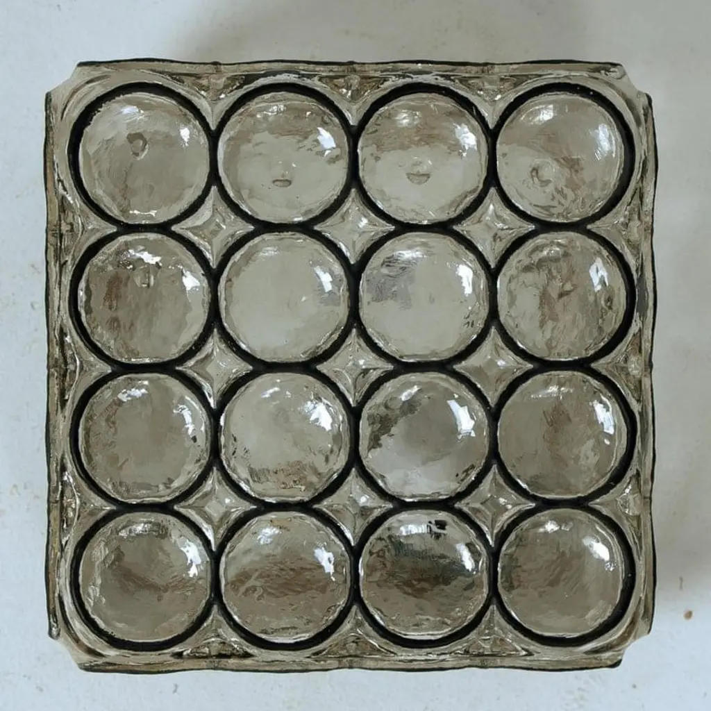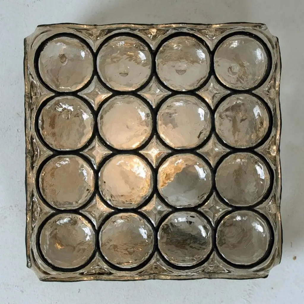 1 of the 4 square iron rings and glass flush mount light/wall light by Glashütte Limburg, Germany, circa 1965. Featuring thick clean heavy blown glass with concaved round iron rings. Illuminates beautifully.Size: 8.7" x 8.7" x 4.7" (22 x 22cm x 12 cm),In very good condition, cleaned and well wired. Each light fixture requires two E27 light bulbs (Max 60W) up to 40 watts each and is compatible with the US /UK/.. standards. - All electrical items function on various voltage standards (from 110 till 240 volts / Ex. USA-UK- etc.) Also LED compatible.