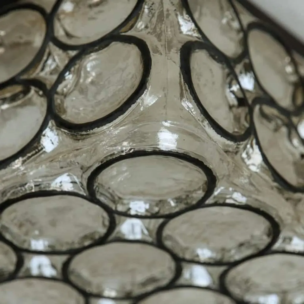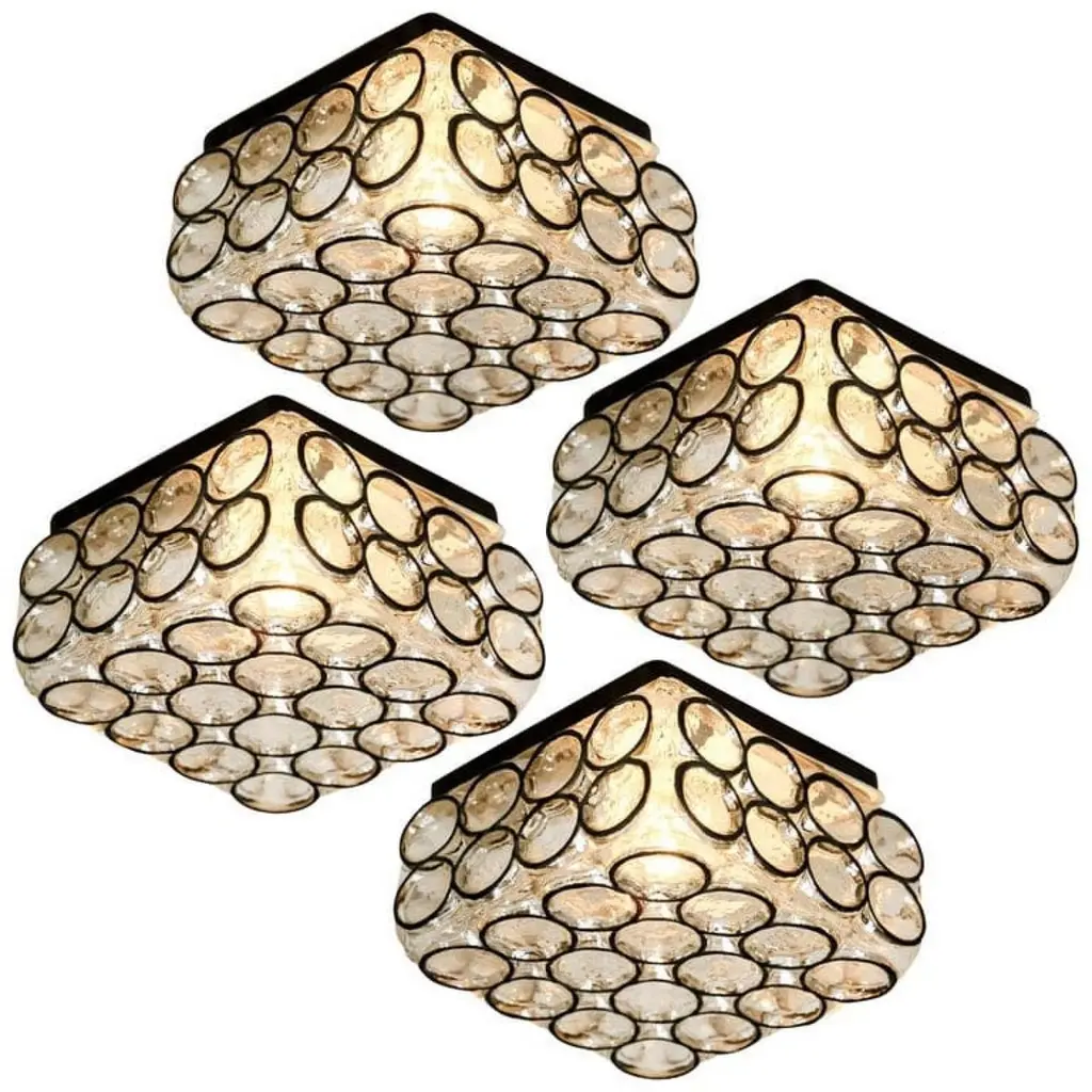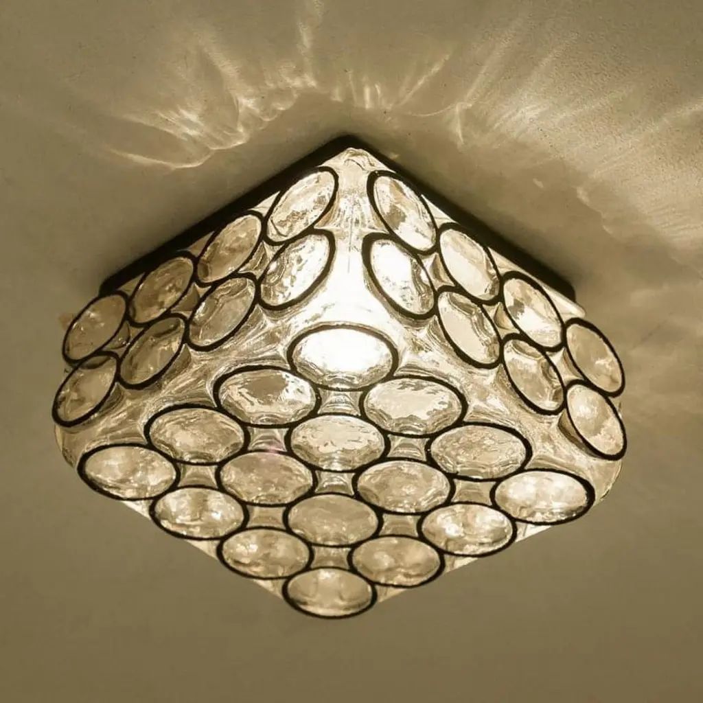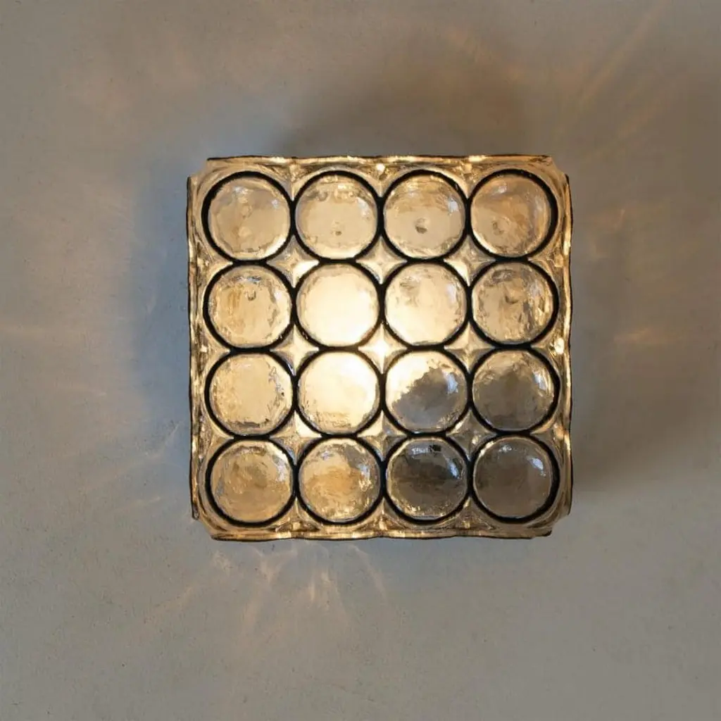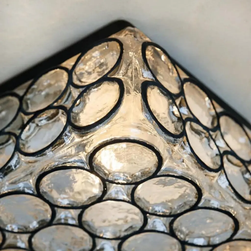 1 of the 4 square iron rings and glass flush mount light/wall light by Glashütte Limburg, Germany, circa 1965. Featuring thick clean heavy blown glass with concaved round iron rings. Illuminates beautifully.Size: 8.7" x 8.7" x 4.7" (22 x 22cm x 12 cm),In very good condition, cleaned and well wired. Each light fixture requires two E27 light bulbs (Max 60W) up to 40 watts each and is compatible with the US /UK/.. standards. - All electrical items function on various voltage standards (from 110 till 240 volts / Ex. USA-UK- etc.) Also LED compatible.