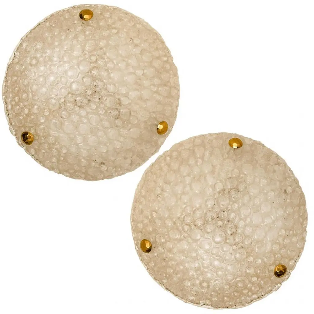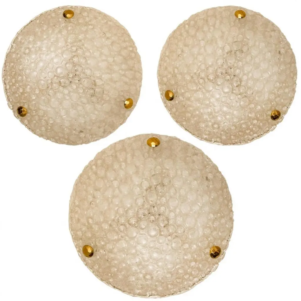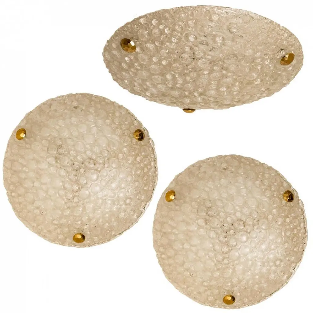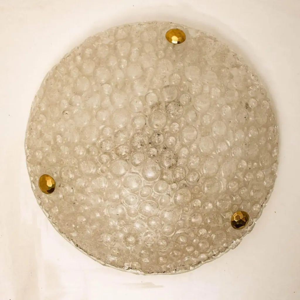 Stunning high-end brass and Murano glass wall light by Hillebrand. Manufactured in the late 1960s-early 1970s. The brass backplate holds a huge heavy blown glass with three brass brackets. The think glass has a beautiful textured structure. Beautiful craftsmanship of the 20th century.The timeless elegance of this flush mount is sure to lend a special atmosphere in every home.Sizes: Diameter 1x 19.7 in. (50 cm)xa0and 3X 15.7" (40 cm)Please notice the price is for 1 piece based on the smallest one.In excellent vintage condition. Good cleaned respecting the beautiful patina, well wired, in full working order and ready to use. The light fixture requires six E14 base bulbs or LEDs.