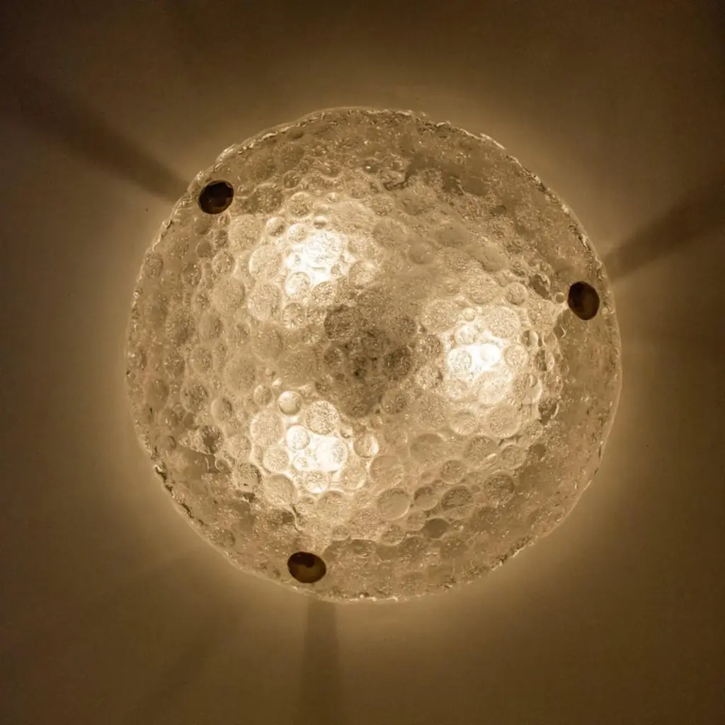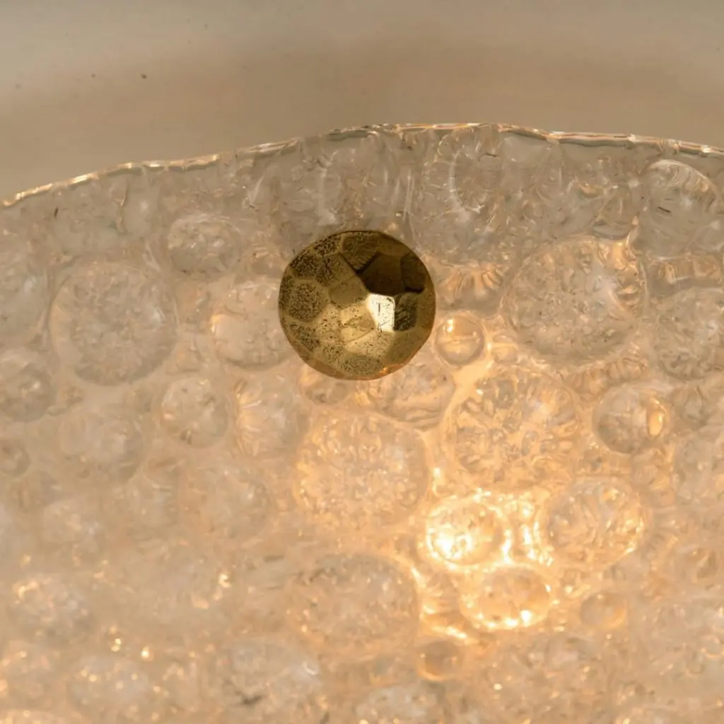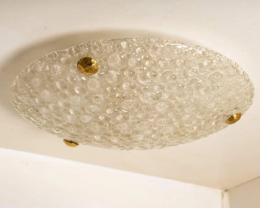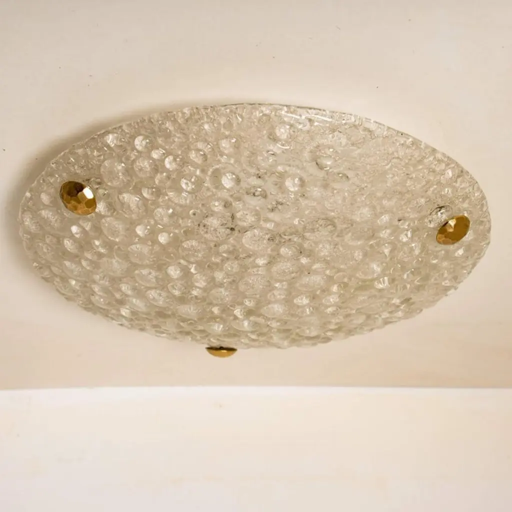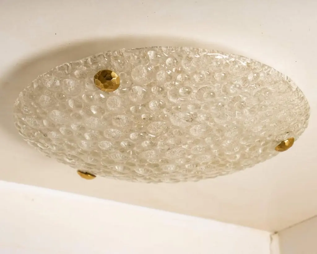 Stunning high-end brass and Murano glass wall light by Hillebrand. Manufactured in the late 1960s-early 1970s. The brass backplate holds a huge heavy blown glass with three brass brackets. The think glass has a beautiful textured structure. Beautiful craftsmanship of the 20th century.The timeless elegance of this flush mount is sure to lend a special atmosphere in every home.Sizes: Diameter 1x 19.7 in. (50 cm)xa0and 3X 15.7" (40 cm)Please notice the price is for 1 piece based on the smallest one.In excellent vintage condition. Good cleaned respecting the beautiful patina, well wired, in full working order and ready to use. The light fixture requires six E14 base bulbs or LEDs.
