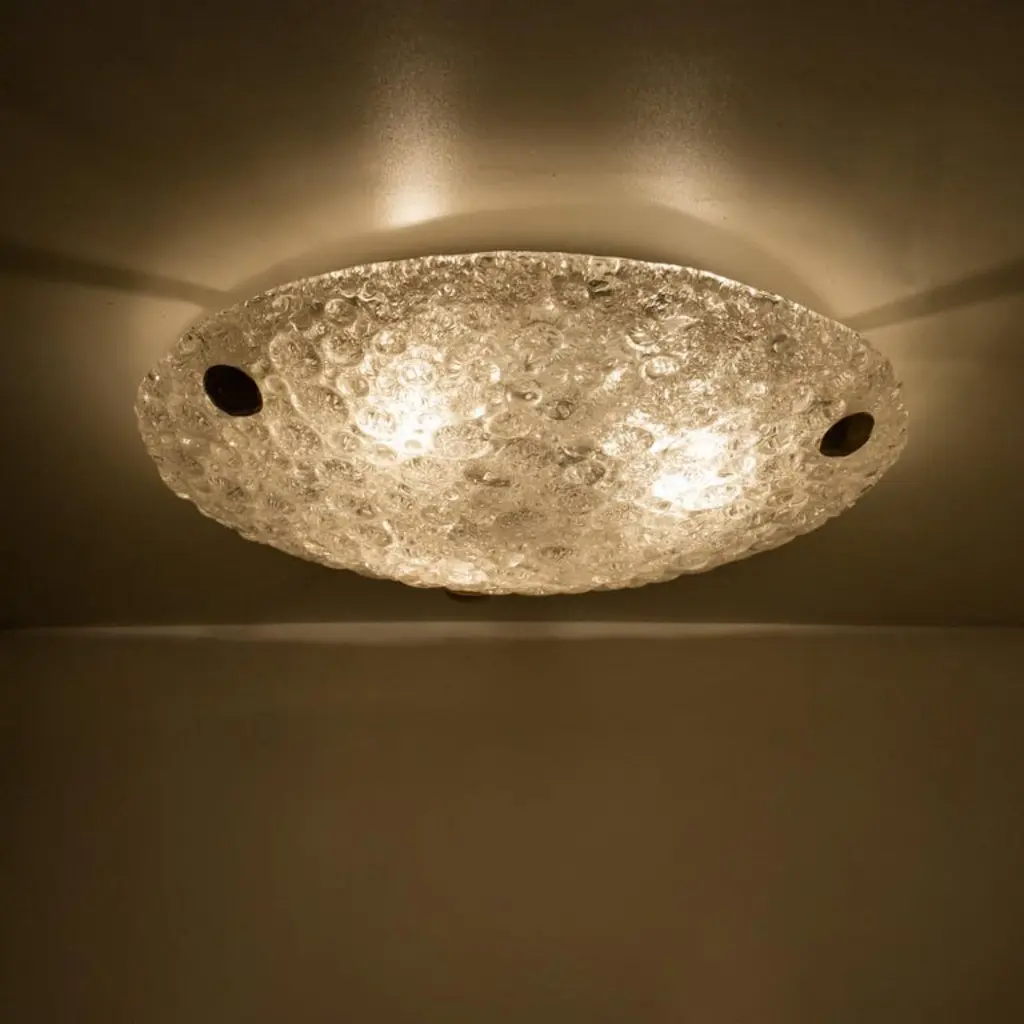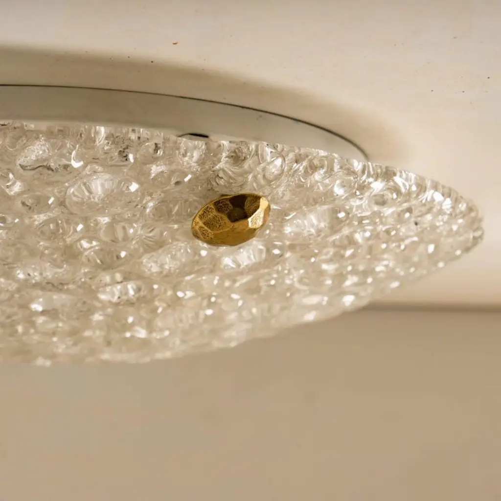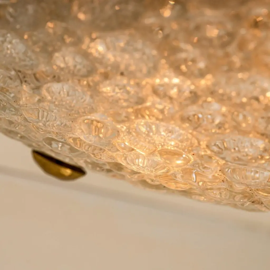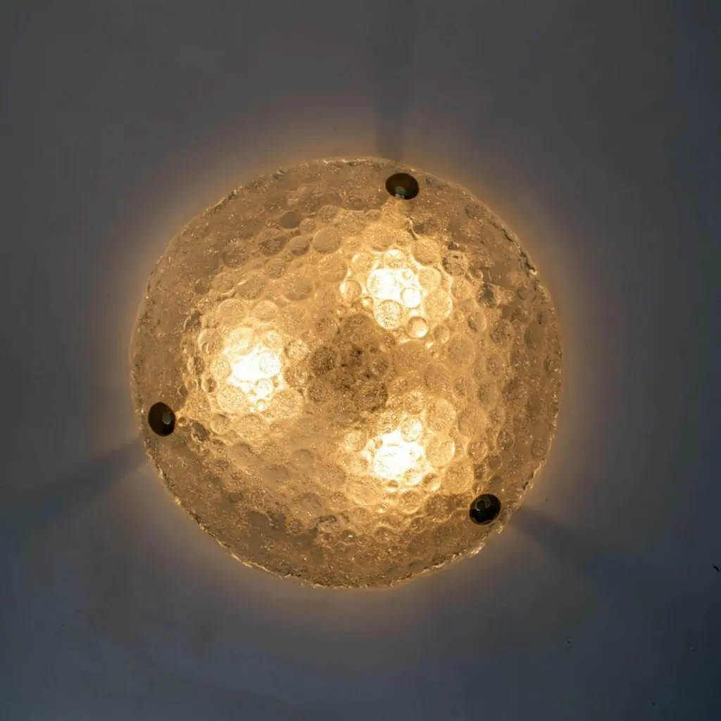 Stunning high-end brass and Murano glass wall light by Hillebrand. Manufactured in the late 1960s-early 1970s. The brass backplate holds a huge heavy blown glass with three brass brackets. The think glass has a beautiful textured structure. Beautiful craftsmanship of the 20th century.The timeless elegance of this flush mount is sure to lend a special atmosphere in every home.Sizes: Diameter 1x 19.7 in. (50 cm)xa0and 3X 15.7" (40 cm)Please notice the price is for 1 piece based on the smallest one.In excellent vintage condition. Good cleaned respecting the beautiful patina, well wired, in full working order and ready to use. The light fixture requires six E14 base bulbs or LEDs.