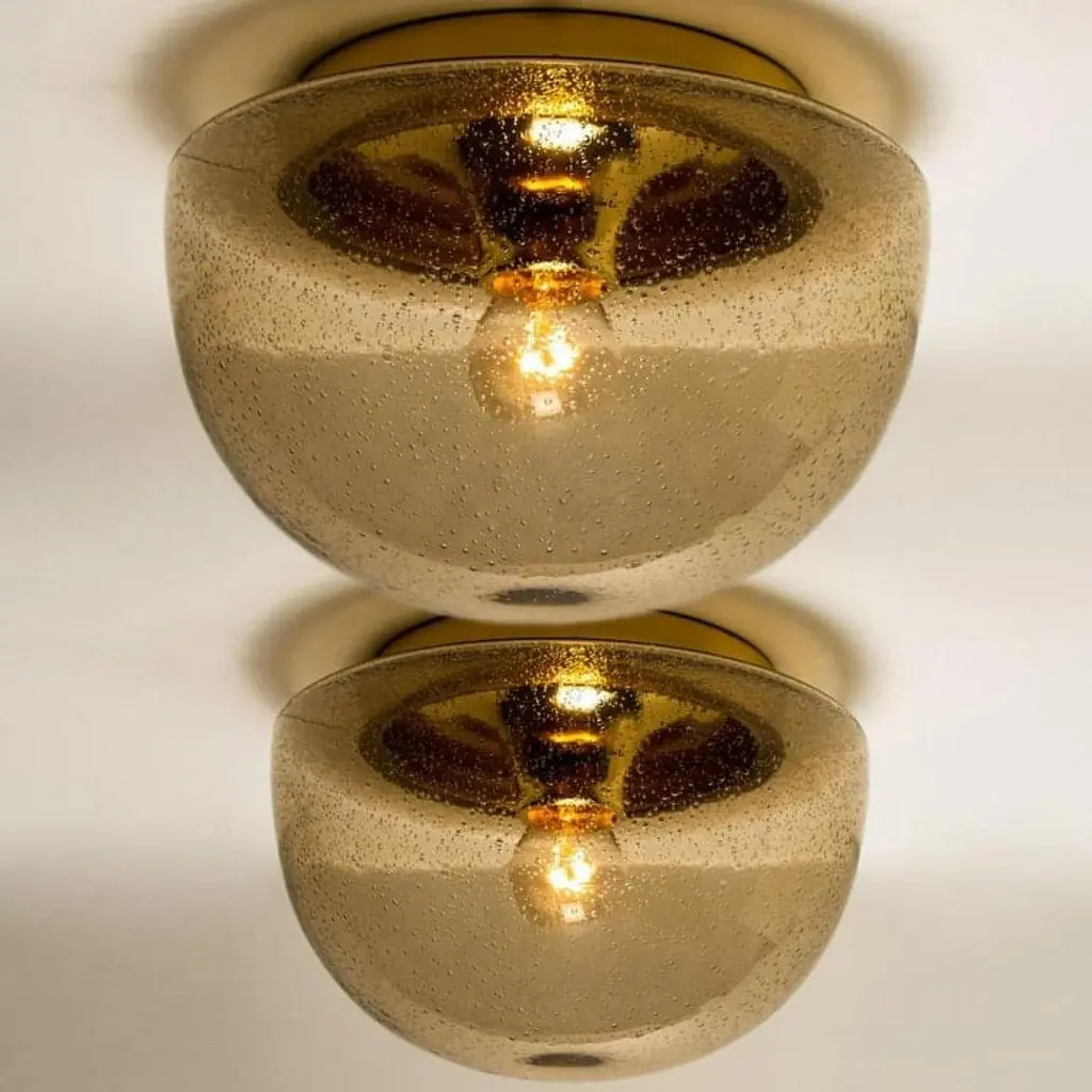 A wonderful mushroom shape flush mount, circa 1970, made by Limburg Leuchten, Germany.With hand blown smoked glass on brass base. Illuminates beautifully.Dimensions: Height approximate 6.7 inch (17 cm), diameter approximate 11.8 inch (30 cm).Very good used condition. The flush mount requires 1 X E 14 bulbs. Up to 40 watts each and is compatible with the US /UK/ .. standards. All electrical items function on various voltage standards (from 110 till 240 volts / Ex. USA-UK- etc.).