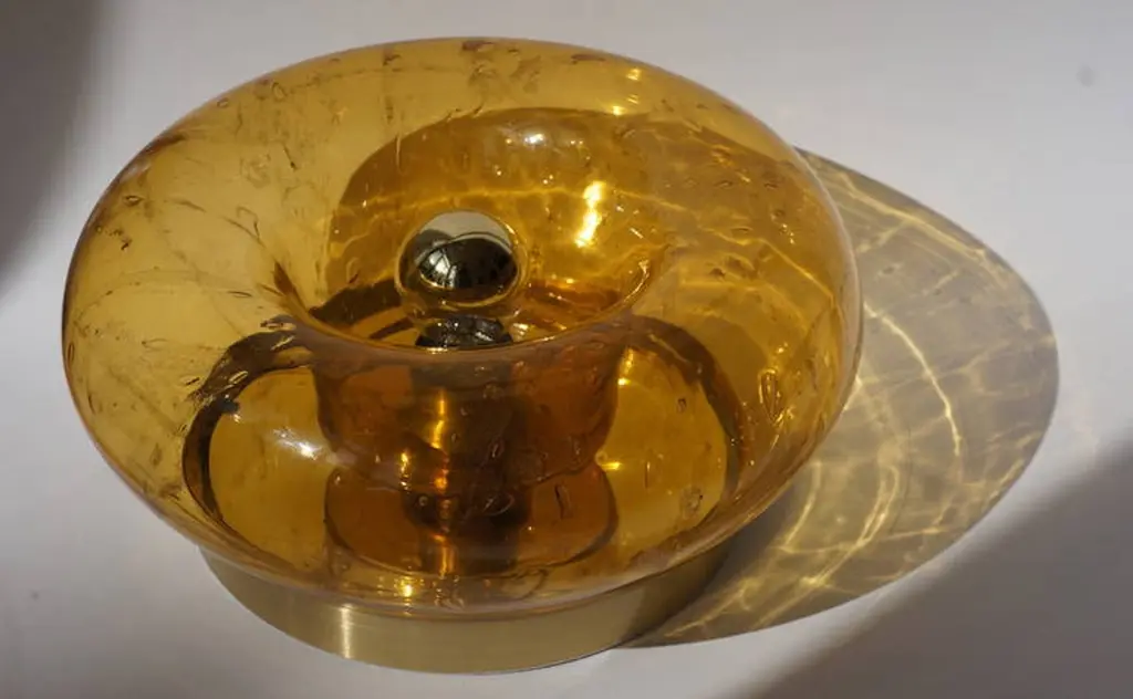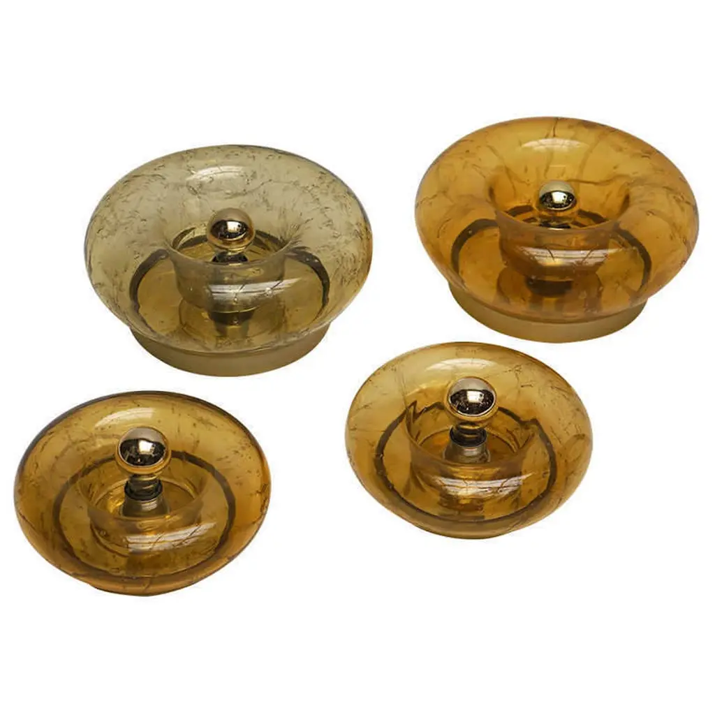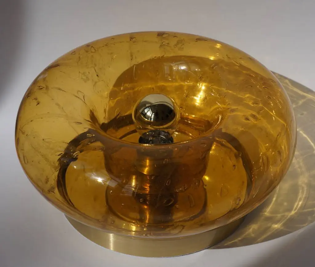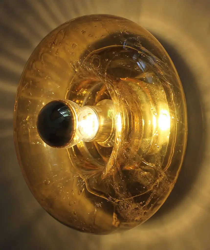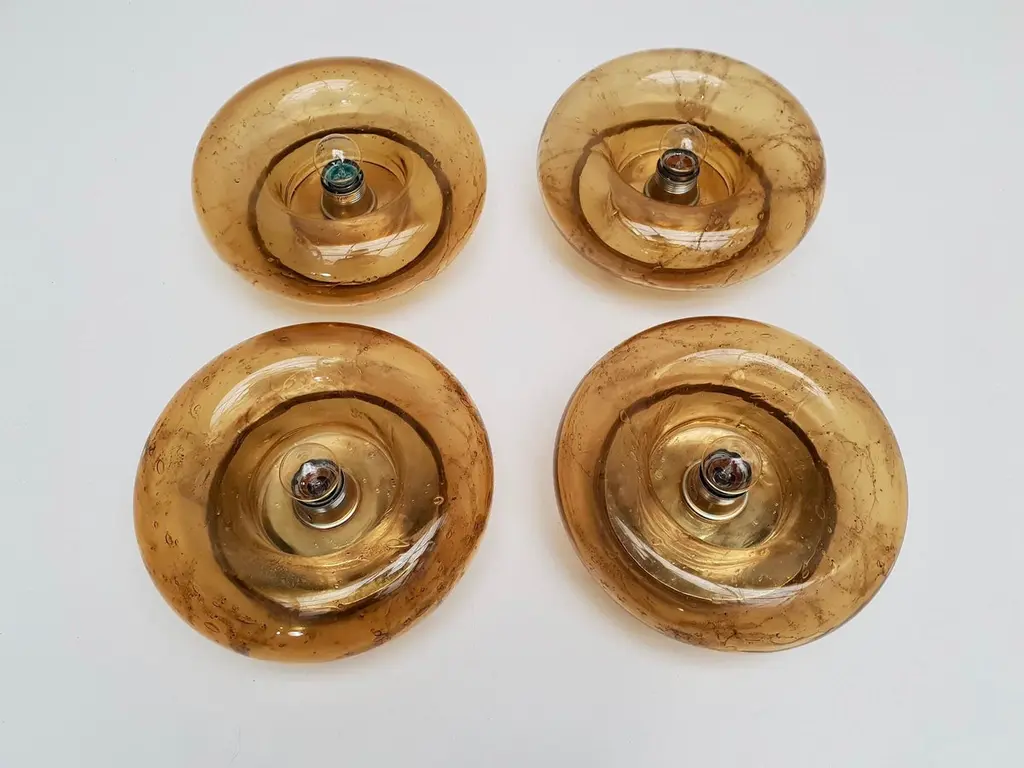 Two glass flush mount lamps by Doria featuring a donut shaped glass ring, the glass rings have embedded swirls and bubbles.There are a total of two available, one of which have the dark amber color and one have the lighter amber color. Dimensions:1 light amber pieces with diameter 13.7" (35 cm), depth 6.2" (16 cm).1 dark amber pieces with diameter 10.8" (27.5 cm),depth 3.9" (10 cm).dark color.The sconce has one socket for incandescent lamps with screw base or E27 type LEDs. It is possible to install this wall light or flush mount in all countries (US, UK, Europe, Asia, Canada), although it may be necessary to purchase different light bulbs suitable for local electricity. It can also be used with a dimmer."The price is for each individual piece."