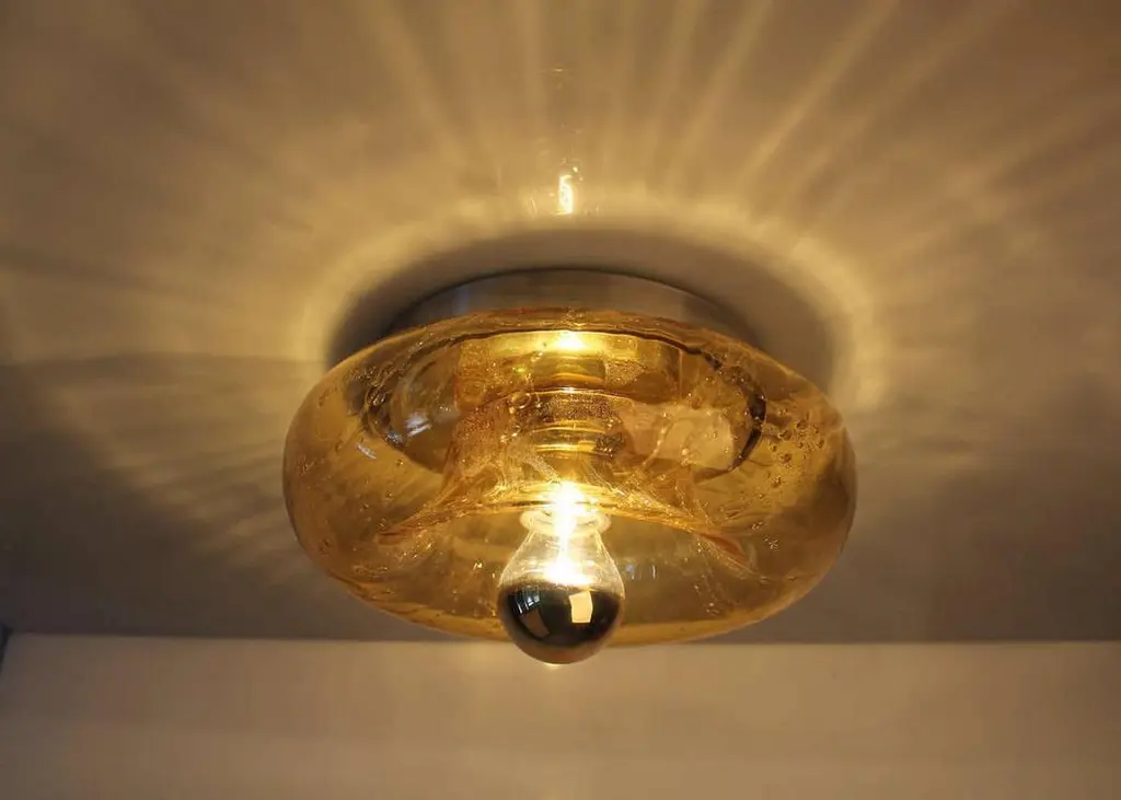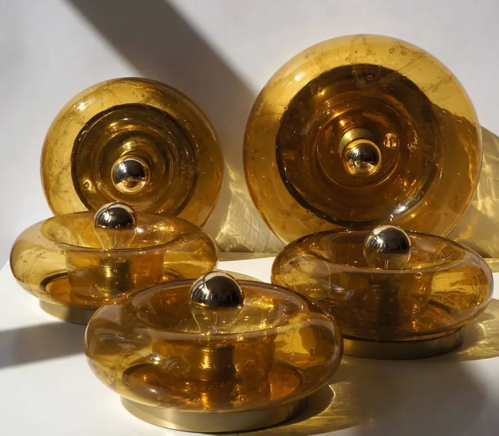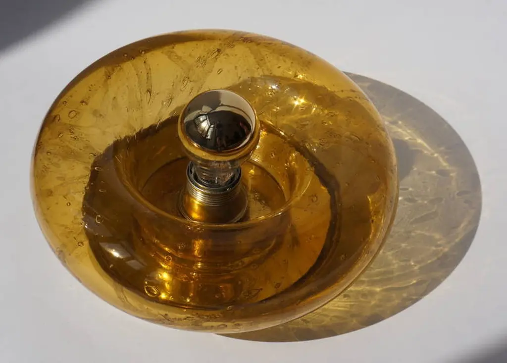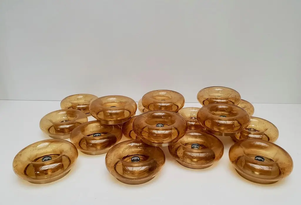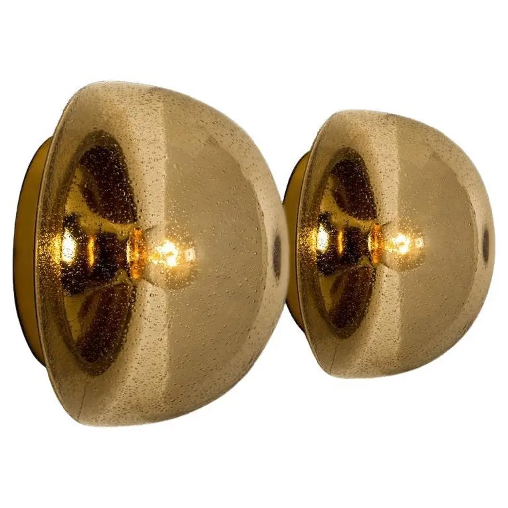 Two glass flush mount lamps by Doria featuring a donut shaped glass ring, the glass rings have embedded swirls and bubbles.There are a total of two available, one of which have the dark amber color and one have the lighter amber color. Dimensions:1 light amber pieces with diameter 13.7" (35 cm), depth 6.2" (16 cm).1 dark amber pieces with diameter 10.8" (27.5 cm),depth 3.9" (10 cm).dark color.The sconce has one socket for incandescent lamps with screw base or E27 type LEDs. It is possible to install this wall light or flush mount in all countries (US, UK, Europe, Asia, Canada), although it may be necessary to purchase different light bulbs suitable for local electricity. It can also be used with a dimmer."The price is for each individual piece."