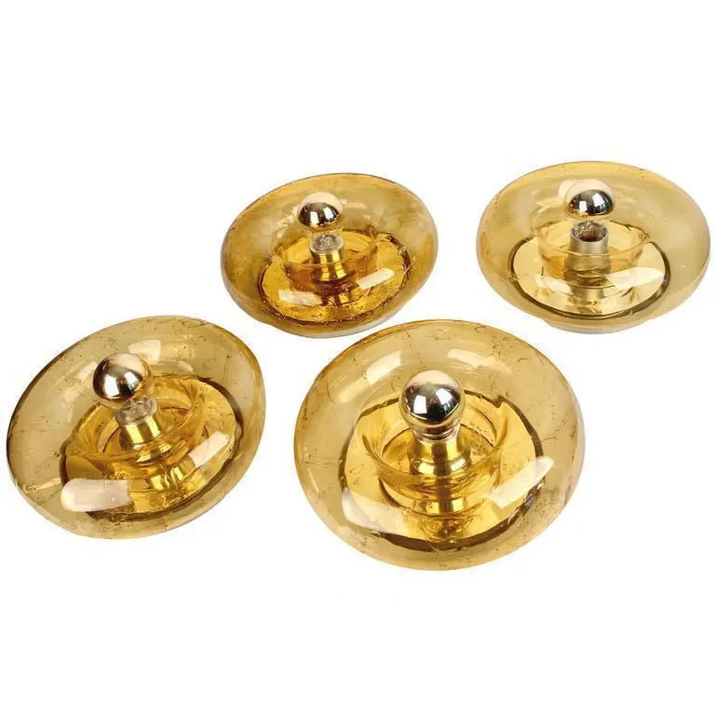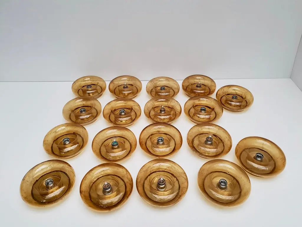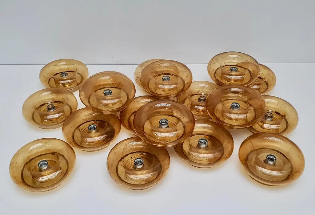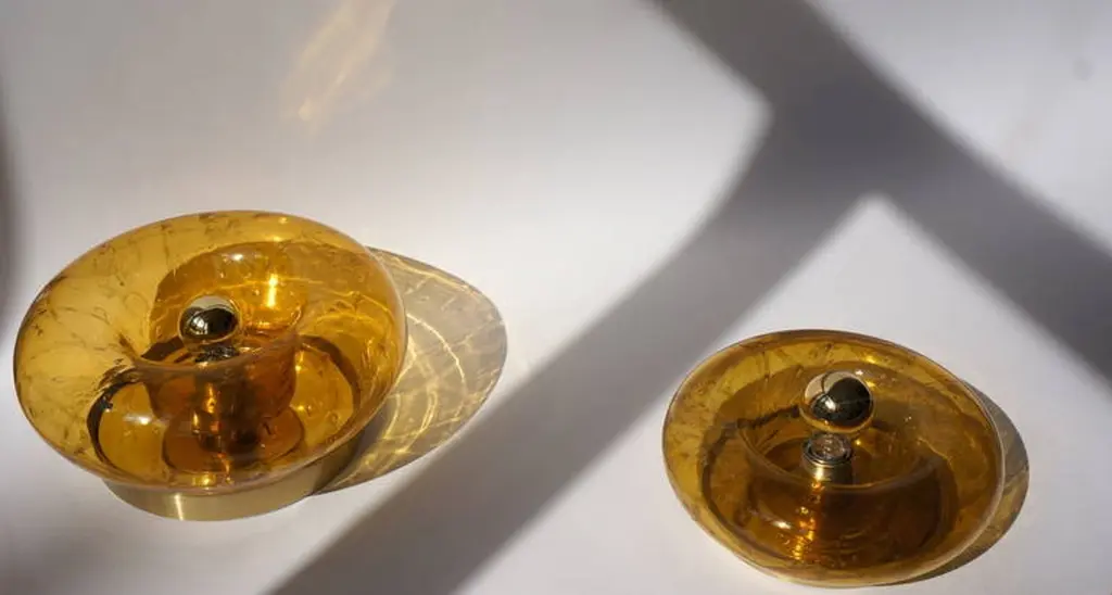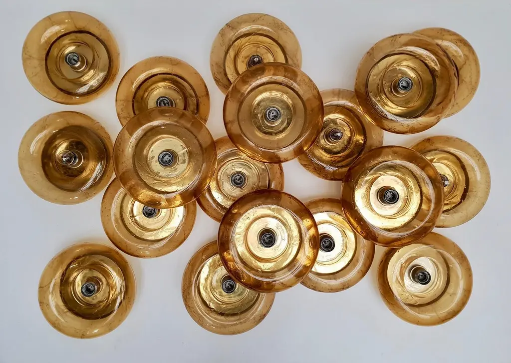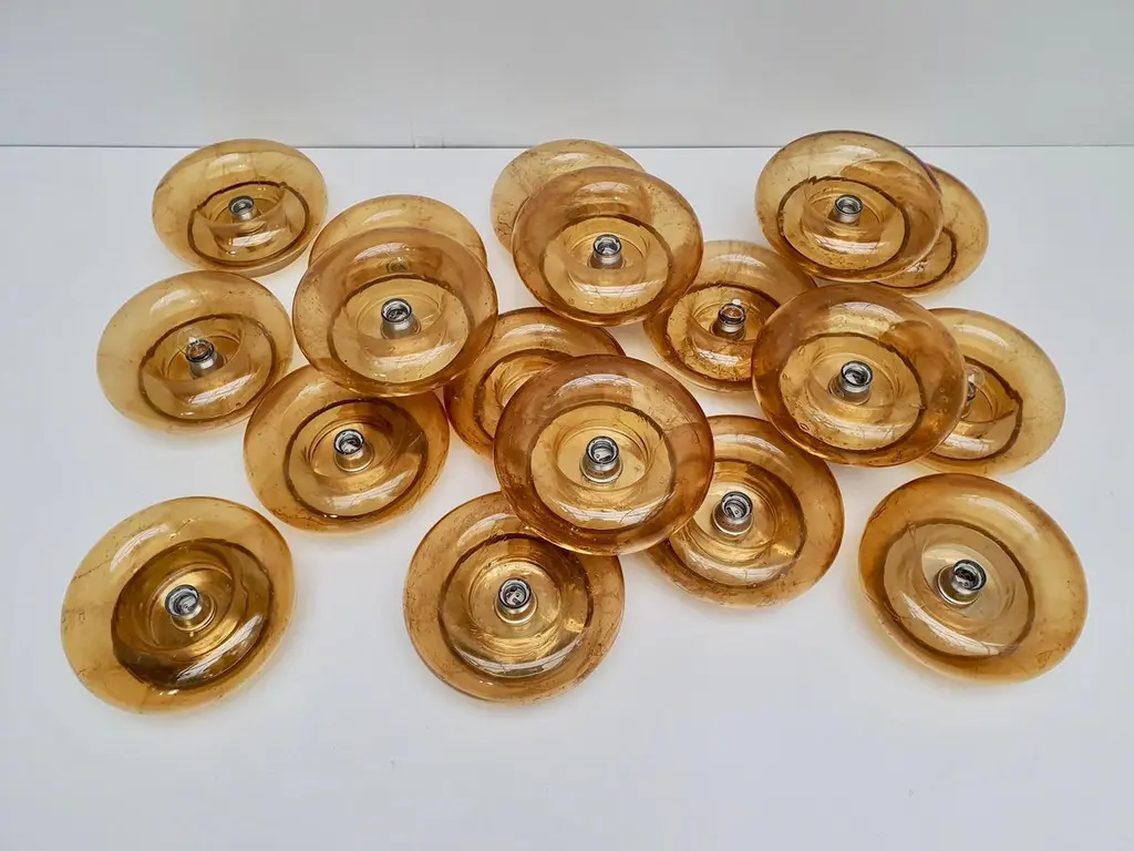 Two glass flush mount lamps by Doria featuring a donut shaped glass ring, the glass rings have embedded swirls and bubbles.There are a total of two available, one of which have the dark amber color and one have the lighter amber color. Dimensions:1 light amber pieces with diameter 13.7" (35 cm), depth 6.2" (16 cm).1 dark amber pieces with diameter 10.8" (27.5 cm),depth 3.9" (10 cm).dark color.The sconce has one socket for incandescent lamps with screw base or E27 type LEDs. It is possible to install this wall light or flush mount in all countries (US, UK, Europe, Asia, Canada), although it may be necessary to purchase different light bulbs suitable for local electricity. It can also be used with a dimmer."The price is for each individual piece."